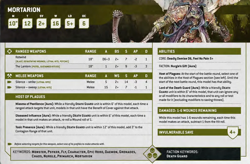 That's a nasty datasheet right there. His aura is a huge deal for Death Guard on it’s own: We’ve seen a few units already who can reduce the movement characteristics of units with their rules, so being able to ignore that is big. Plus, ignoring stuff like stealth or indirect fire matters quite a lot too. His host of Plagues Auras are also neat, I think