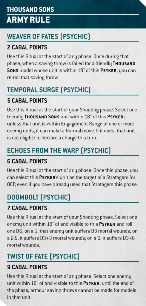 Cabal of Sorcerers and essentially models with this ability generate a bunch of points at the end of your Command phase. From the two we’ve seen, Ahriman generates 3 points and the Aspiring Sorcerer model in the Rubric squad generates 1. These points can be used all through your turn and the opponent’s turn, before resetting to 0 at the start of your next Command phase.