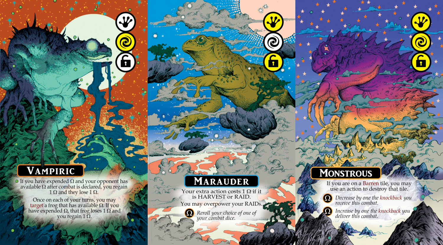 These frogs can fight, and with the right powers they can fight hard. If you're in the same area as an opponent you can expend Oomph, your life resource, to engage in titanic combat. The goal is to punch your opponent off the Shard if necessary and then square into an alternate dimension. Doing so causes them to vomit up any land in their stomach and into yours if you'd like, and opens their Vault to raids.