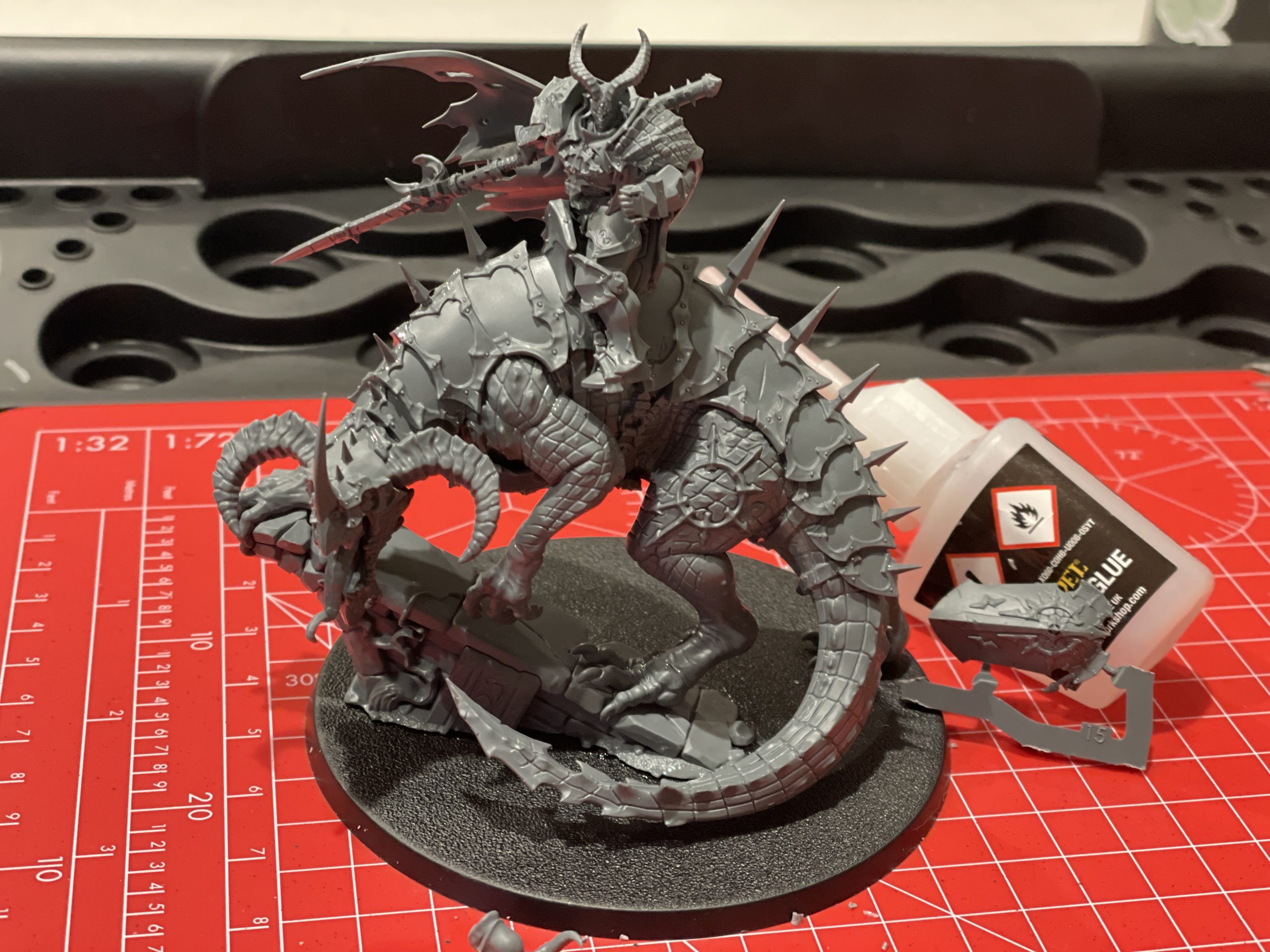 Daemon Prince. I had one moment where the central body of her mount, Thanatorg, collapsed in on itself, but I was able to right it and cover up any problems with the armor. Speaking of hiding problems, almost every seam is hidden by scales or armor, save for a few on the monster's back. As much as I don't like the sprue layout, the actual engineering of this kit is pretty excellent. The only option is an admittedly very cool helmeted head for Abraxia that I didn't use here, but it won't go to waste. Some Chaos Lord down the line will be getting a fancy hat for sure.