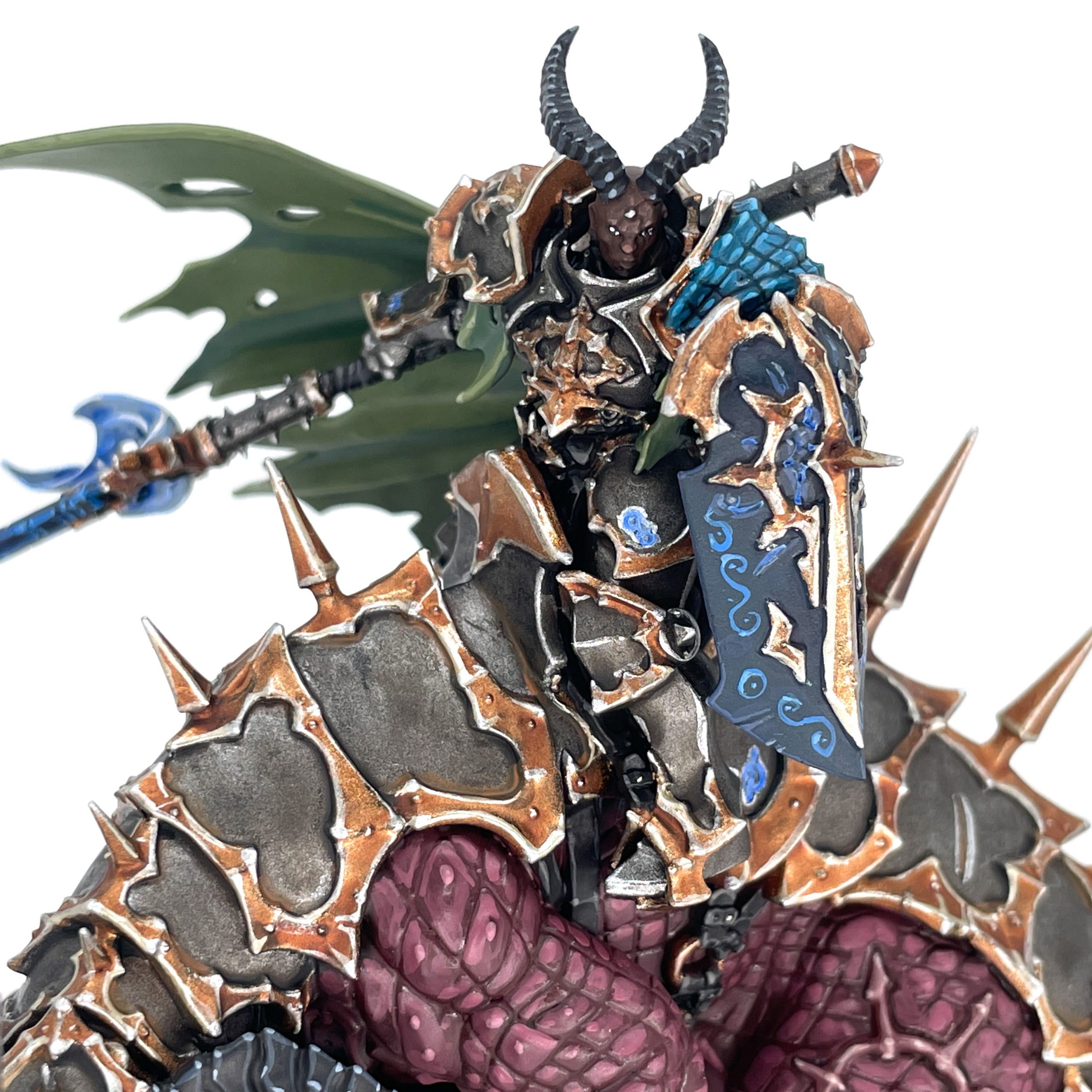 Chaos Chosen. It was easy to paint the shield separately and pop that on after the fact. I simply mounted the chunk of sprue containing the shield on a base and painted it on its own. The only real tricky part is painting around her cape and accursed spear, Gorbolga. I nearly snapped the spear off while handling the model, and much like the spikes on the back of Thanatorg, it's fairly fragile. I opted for the bare head so there was another focal point, and tied her horn color in with those of her mount.