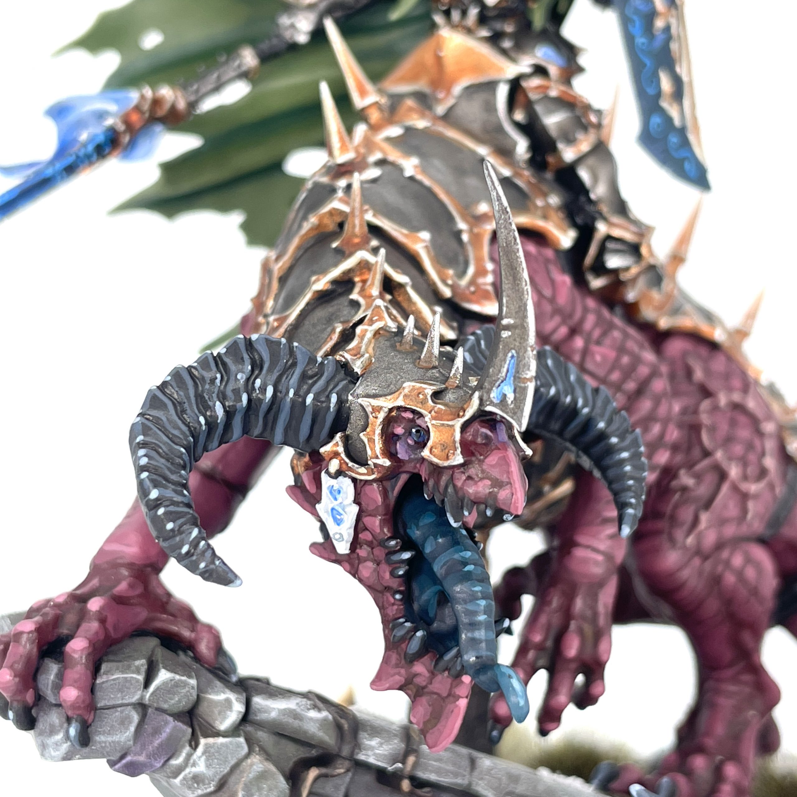 Thanatorg was a really fun monster to paint. I started from Gal Vorbak Red and worked my way up from burgundy into magenta, mixing in pinks and pale flesh tones for the scales and underbelly/Chaos Cutiemark respectively. I was very loosey goosey with it, as I wanted to keep things organic and avoid edge highlighting every single scale twice, as is my typical practice. I gave him blue eyes to tie him into the general color this army uses for "magic" and glazed blue around the eyelids to tie those in and look bruised. Honestly, he was easier to paint than your average Varanguard mount, as there's no weird mouths or mutations to speak of - just scales, teeth, and horns.