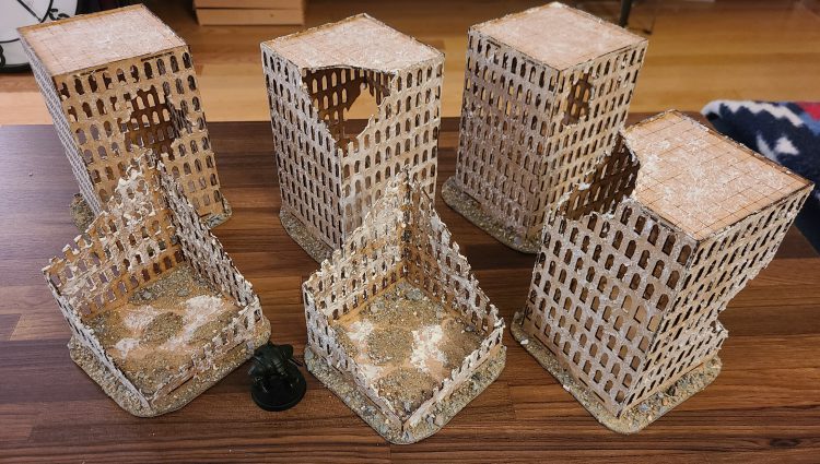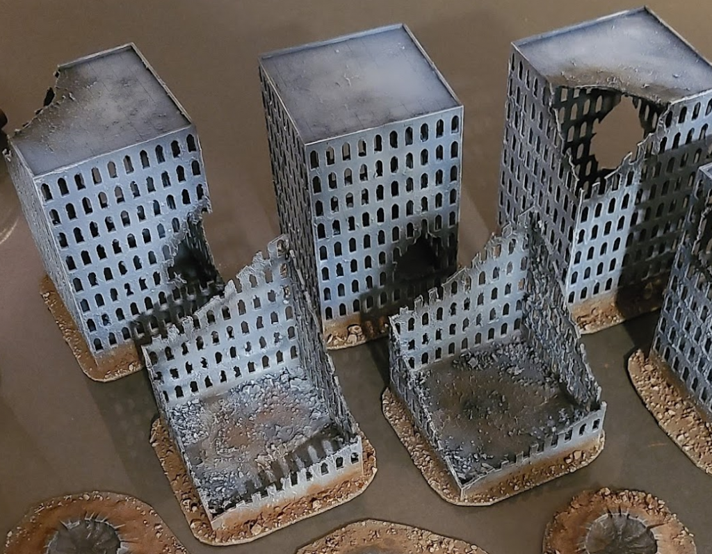 - (Optional) Adding Scorch Marks: Drybrush some black paint on the ruined edges of the buildings to simulate damage. You can highlight this further with some grey paint, like Mechanicus Standard Grey.