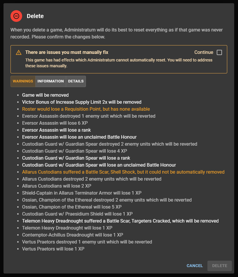 For example, you record a game in which a unit gains a Battle Scar. Afterwards, you spend your only Requisition Point on removing that scar via Repair and Recuperate. However, you decide to hide your shame and delete the game entirely. What should Administratum do? In principle this scenario is easy to resolve: everything stays the same. But what happens if you spent that RP on a different Requisition like buying a Warlord Trait? Does deleting that game also delete that Warlord Trait? What if you removed that scar via a codex-specific mechanic that didn't cost RP? What if a unit leveled up and earned a Battle Honour, which you claimed as a Weapon Enhancement - does Administratum roll that enhancement back?