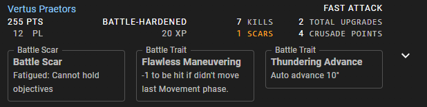 An at-a-glance reference to all the scars and upgrades on the unit. No more frantically flipping through tabs or opening different pages to find your upgrades.