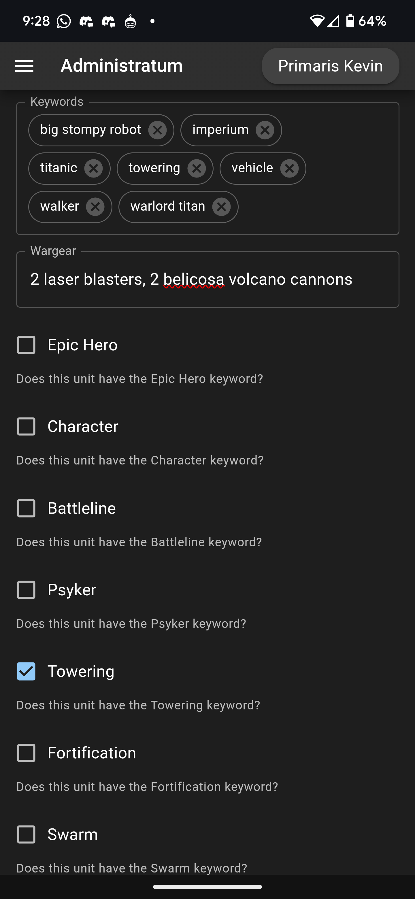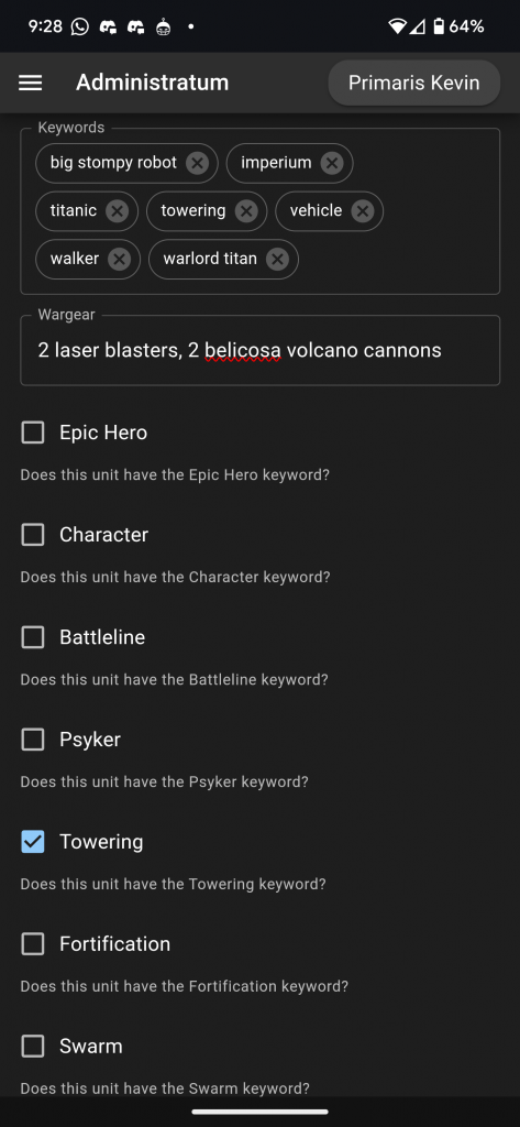 Popular keywords automatically fill in as you type them, or you can add your own. Wargear is going to be done manually, and can be used to select specific equipment for that Datasheet. You can also click on the checkbox next to a particular keyword and it will automatically populate the keyword box (and vice versa). If you're adding a unit from a previous campaign then you can fill out the relevant information in the Previous Battles section.