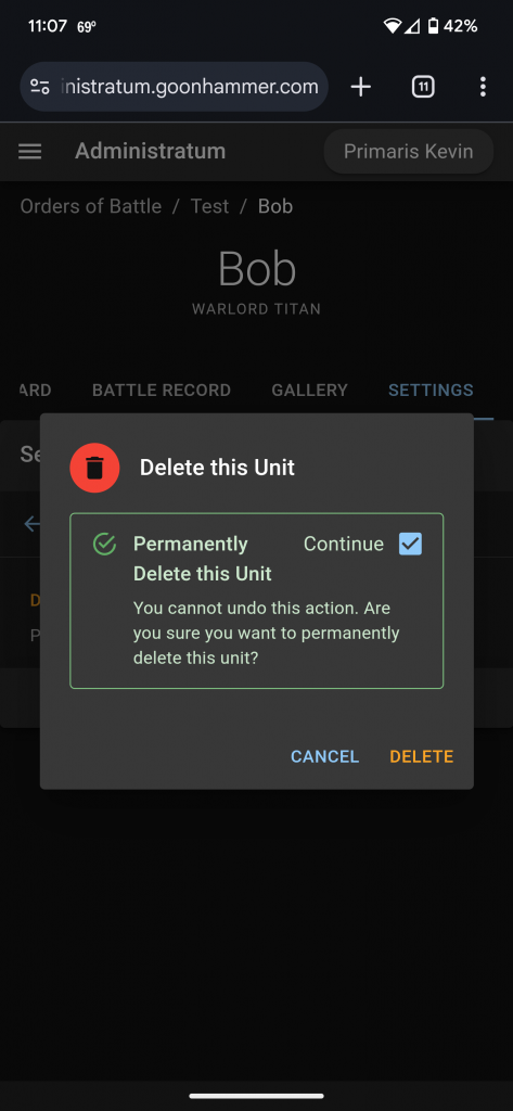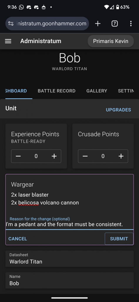 The other entries are editing by clicking on the Settings tab. There you have the option to edit Basic Settings to change the name and description, the Crusade Settings to edit everything else, or to delete the unit. The entries in the Crusade Settings option are similar to what you would see when you created a unit from scratch, along with an Advanced section for adjusting variables that are used by Administratum to automate and track unit progress. You shouldn't need to edit these.