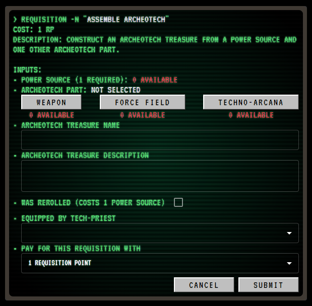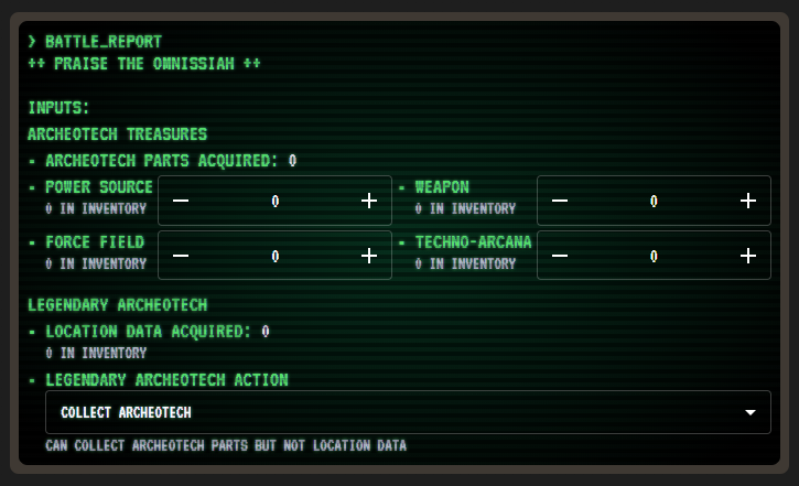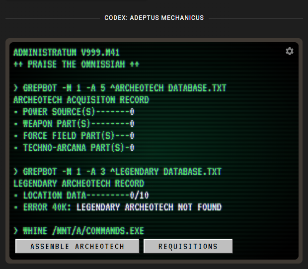 I had so much fun building the terminal UI for the Codex: Adeptus Mechanicus add-on, that I'm legitimately considering building it as a site-wide theme. It would take an absolutely massive amount of refactoring, but it would be cooool.