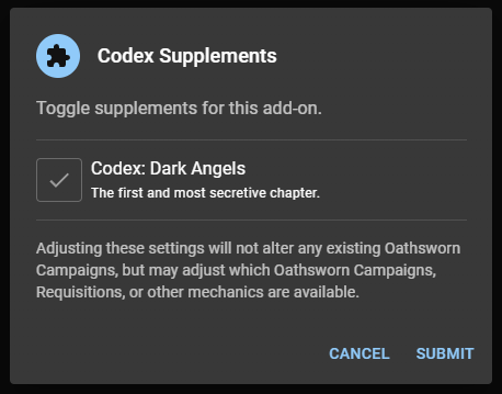 Toggle on the Codex: Dark Angels supplement by checking the box and clicking submit. With just that, you've unlocked the full range of Dark Angels goodies. New Oathsworn Campaigns, new Requisitions, and a brand new way to spend those honorable Honour Points on unit promotions: Inner Circle Advancement.