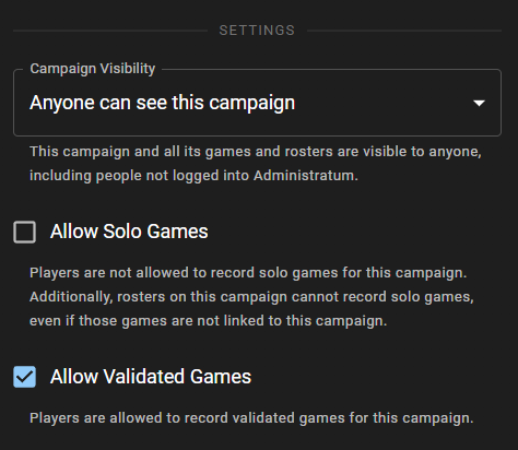 - Campaign Page - Settings Tab - Allow Validated Games - Toggle whether or not validated games will be allowed for the campaign. Toggling this off prevents rosters in the campaign from recording validated games, even if those games are not linked to the campaign