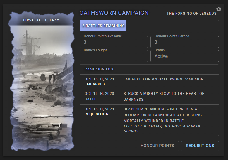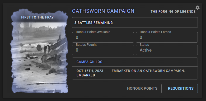 Once you've embarked upon an Oathsworn Campaign, you'll unlock a whole host of Requisitions, including a unique one depending on which type of Oathsworn Campaign you embark upon. On your Roster dashboard, you'll also see a Campaign Log that will track progress, promotions, and more.