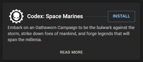 Before taking your first step, you must first plan the journey ahead. And that journey begins with heading to your roster's Settings tab and installing the Codex: Space Marines add-on. If you are an extra cool Warhound Patrons then you can install this on your Campaign and unlock it for all members! If there are any Space Marine players in your Campaign, then it installs automatically in their Roster!