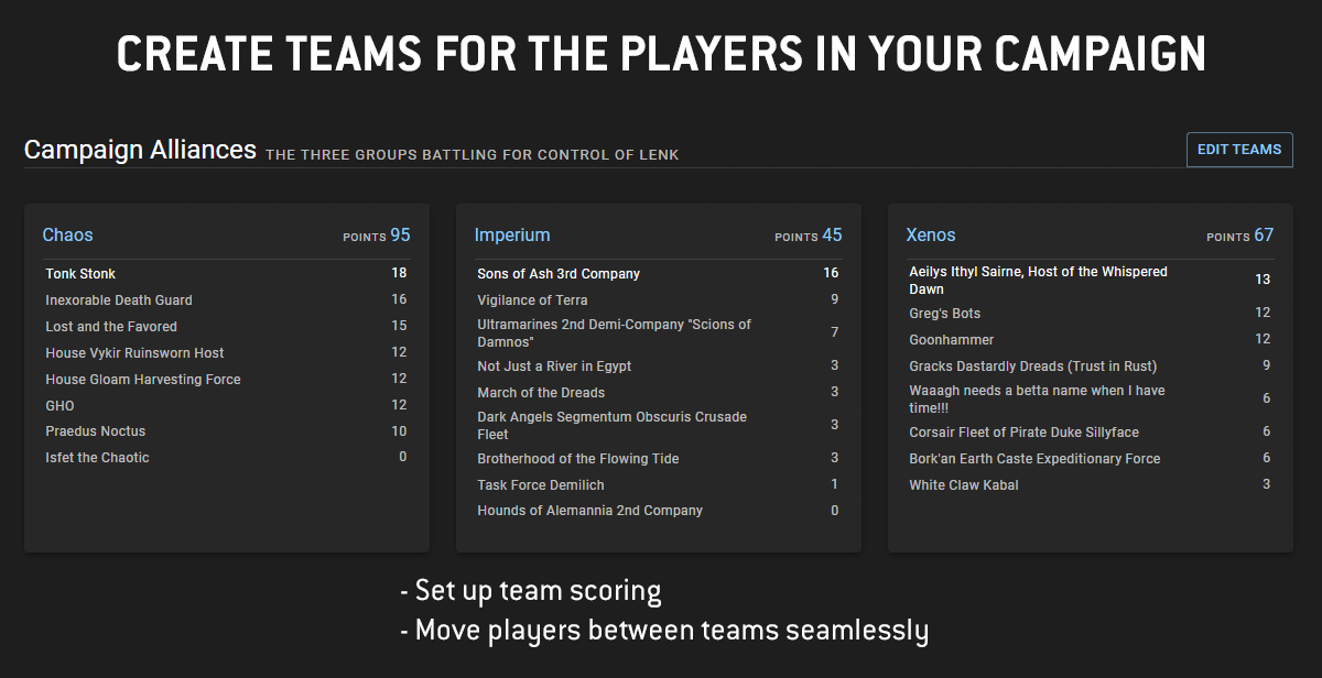 Warhound Tier ($10/month) and higher will now be able to add player teams to the campaigns they create. This allows you to organize their players into alliances, factions, teams, location-based groups - you name it. If you've wanted to implement some of the campaigns from the 9th edition War Zone Campaign books and track scoring, now we've got you covered.