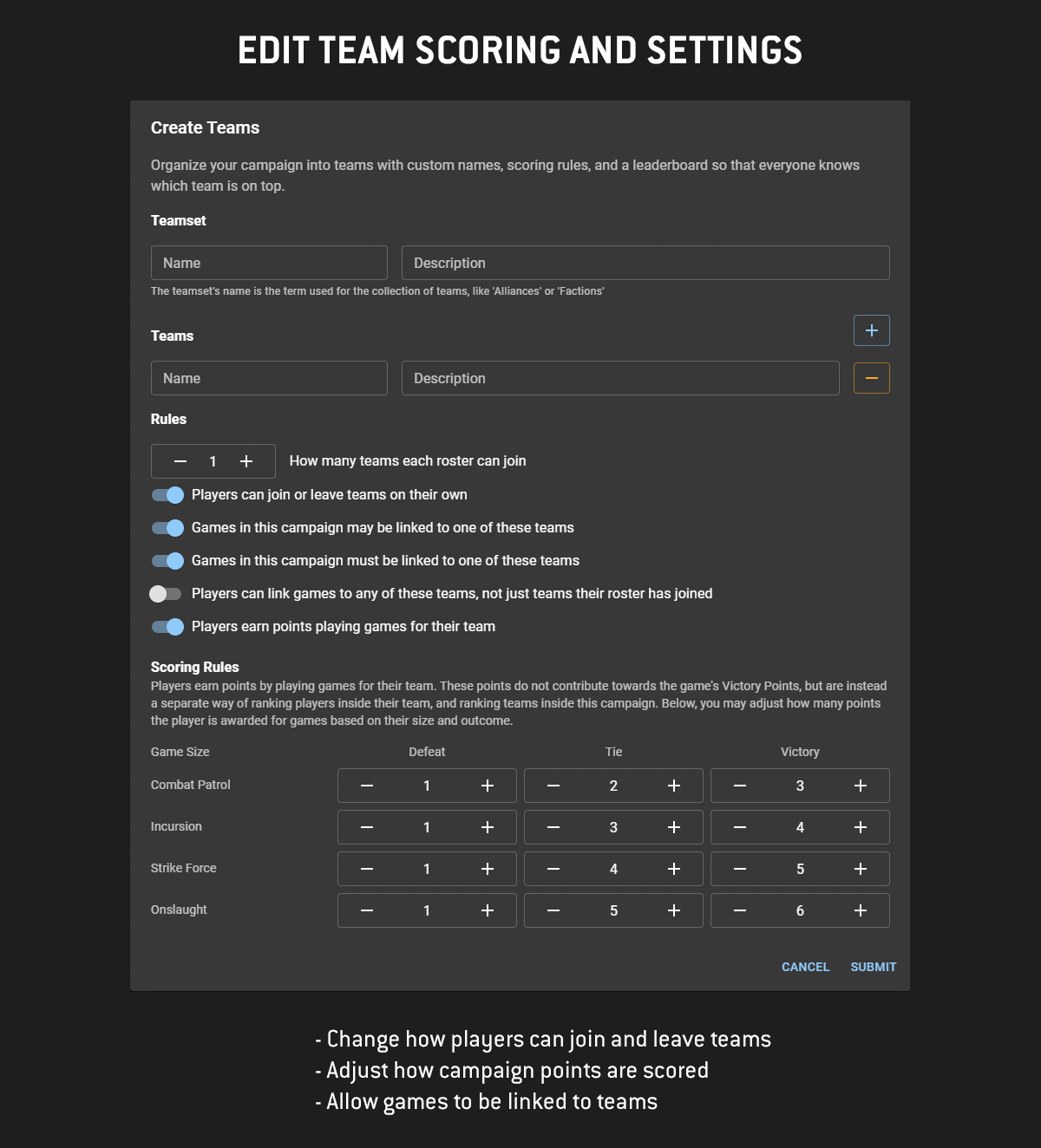 As a campaign owner, you can create Teamsets - or a "collection of teams" - name them, and then add as many individual teams to them as you want. Want to set up player groups based on day of week availability? Create a teamset for days of week and make them non-scoring, then sort players into them to make for easy scheduling. Want to do superfactions and subfactions in your campaign? Create a teamset for both, then sort players into each as needed. Want to let players join or leave teams on their own? You can do that too, allowing players to act all all sorts of intrigue, skullduggery and backstabs. You can give them even more freedom bay allowing them to choose which team to allocate their wins to on a game-by-game basis!