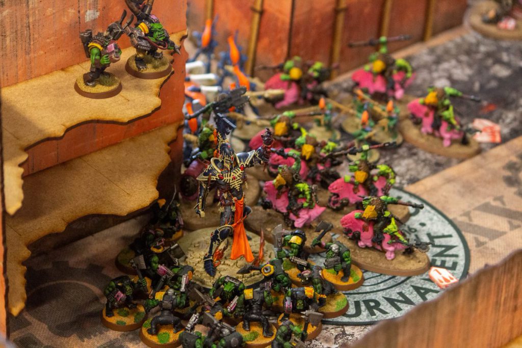 I immediately recognised an army that had caught my eye earlier in the event; several of Jonno’s Death Guard have an extremely-convincing OSL effect achieved by literally just putting sickly green LEDs in them. Looking closer at the army I found the overall colour scheme worked to support that - he’s really committed to the “green, green and more green” Nurgle look, but the grimy green-brown of their armour is set off with a much brighter grey-green smoke on a few key models to add a hit of contrast and interest without seeming to betray the theme of Nurgle’s dull monotony.