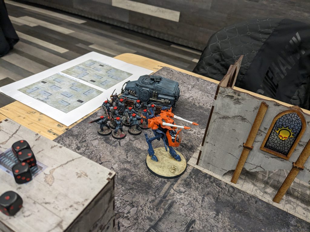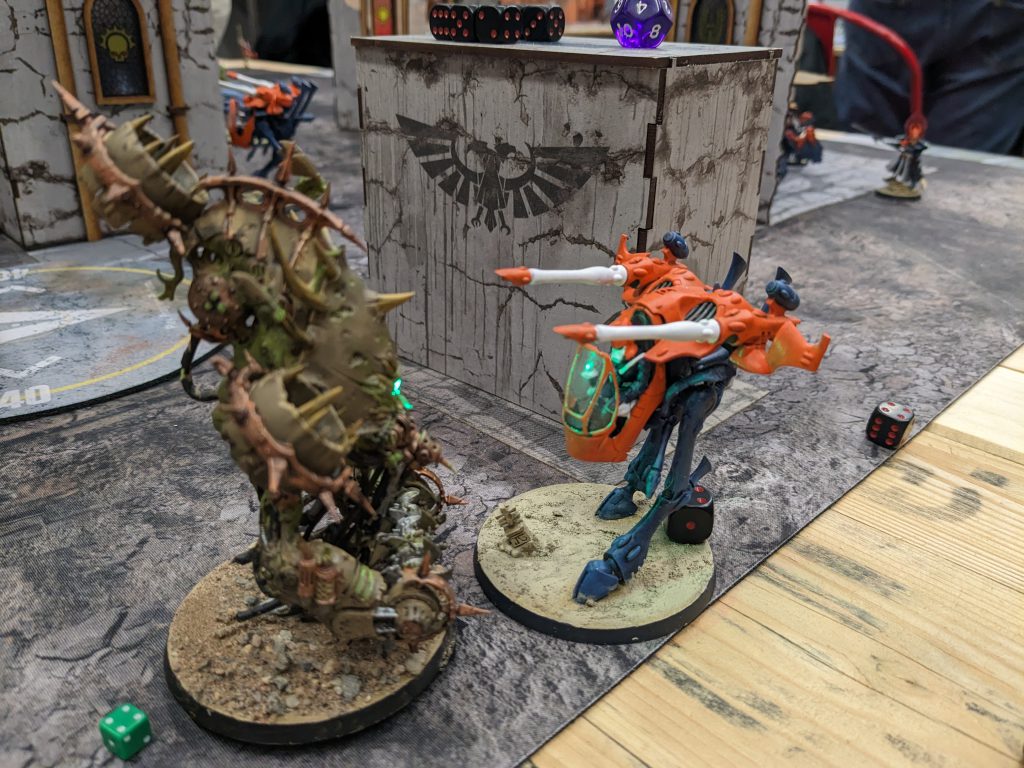 Right back in it for the first round! I’d played a few games against Chaos Knights in Ninth, but hadn’t run into them this edition. Mostly that left me with a lot of respect for the mess a chaincannon can make of a unit of Aspect Warriors or Windriders if it gets a clear shot. Across the board, Jed’s army caught my eye with a series of conversions, adding a bit of variety to what could have been half a dozen identical War Dogs; the lashing spines of some of the melee models (Maulerfiend tendrils, as far as I could tell!) were the most obvious, but far from the only bit of customisation going on.