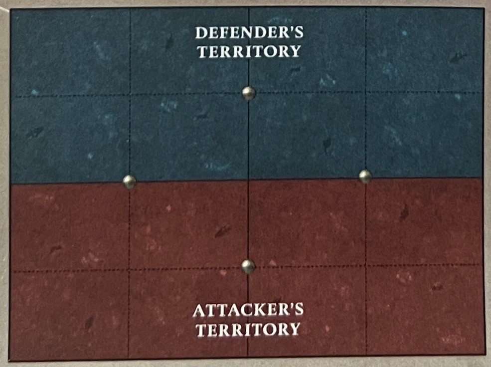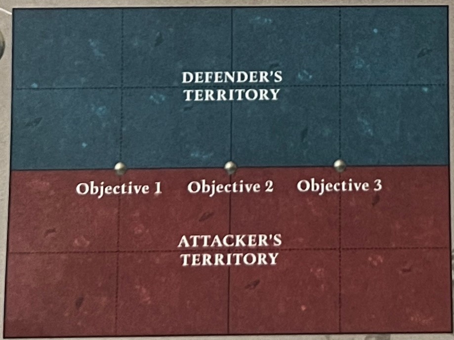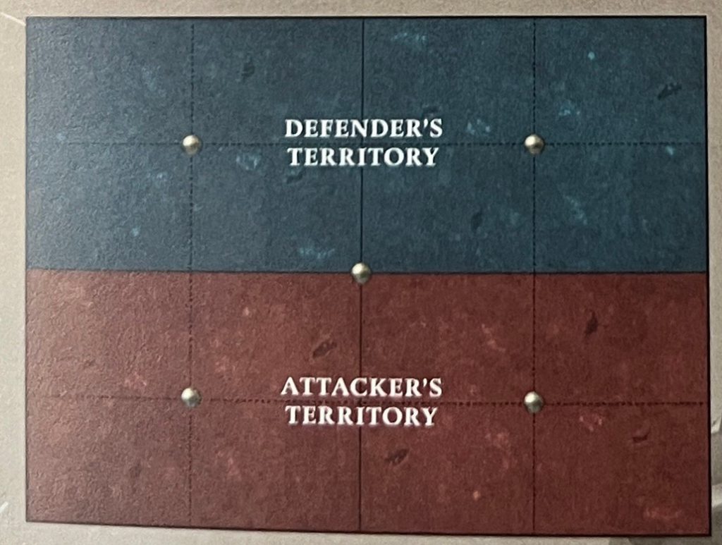 - Players set up on the long board edges, with territories meeting in the middle of the board. Units must be deployed at least 9" away from enemy territory.