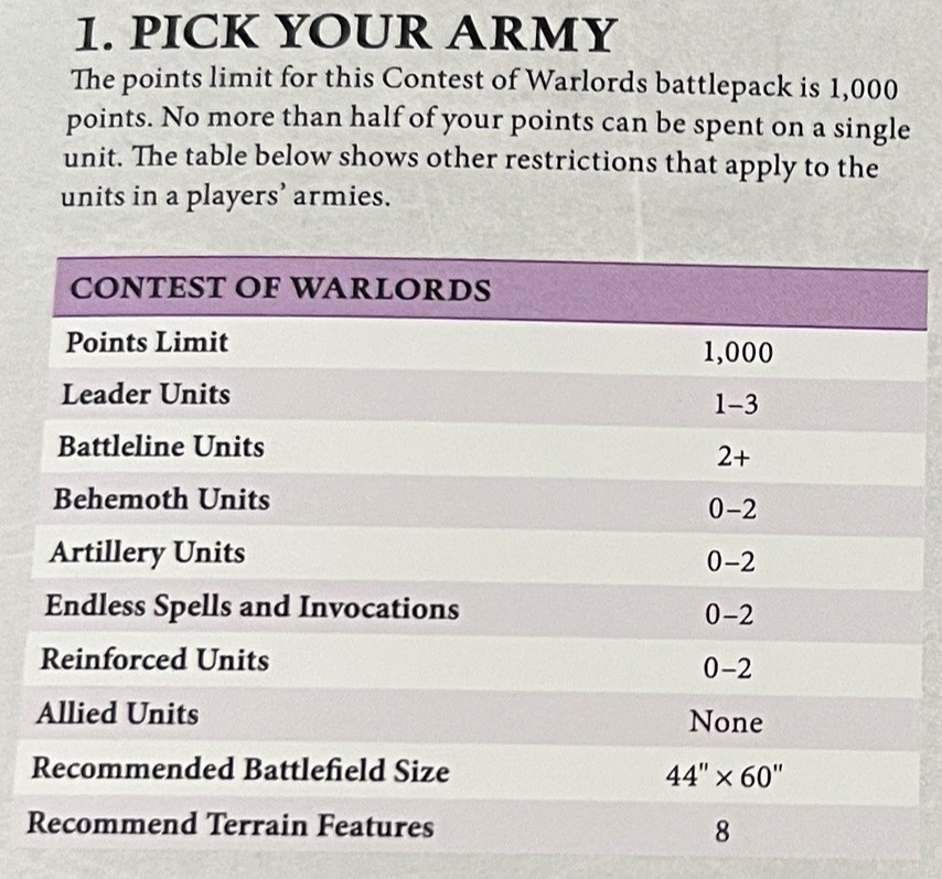 on Twitter. Developed by the AoS design team after a 1,000 point Contest of Generals (core book matched play) event, based on their experiences plus feedback from other players at the event, this pack iterates on the Contest of Generals rules with some extra rules (no single unit larger than 350 points, summoned units are half size, inserting the usual Pitched Battles rule of first turn going to the player who finishes deploying first) alongside some tweaked Grand Strategies, Battle Tactics and battleplans. Overall this seemed well-received by the community, and it was great to see a non-standard battlepack getting the kind of care and attention usually reserved for 2,000 point pitched battles.