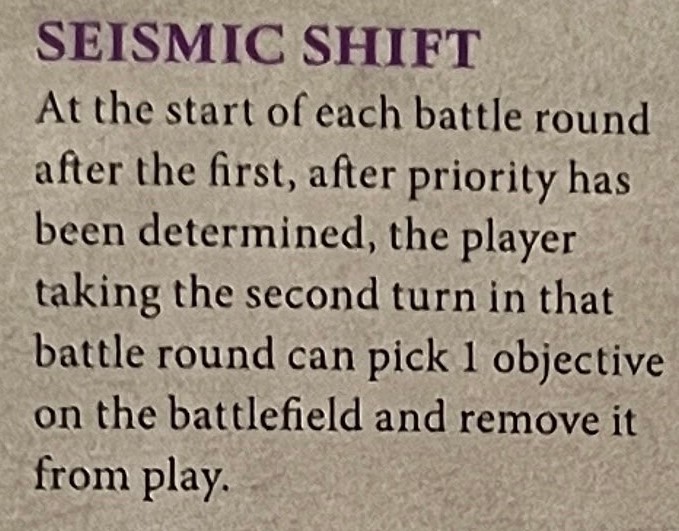 Repurposing a realm rule from the General's Handbook 2021, Seismic Shift sees objectives disappearing from the board, meaning generals will need to plan for flexibility and be ready to change plans at short notice.