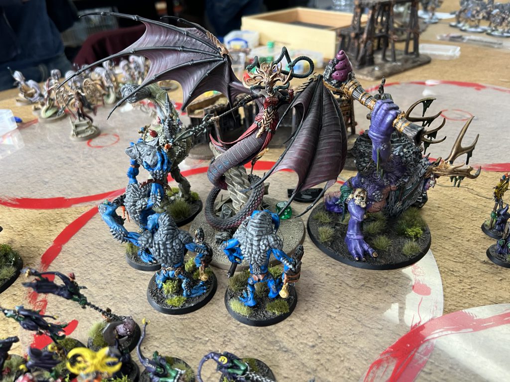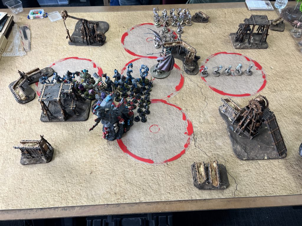 First game Saturday morning was against a local gamer who I'd not had the pleasure to play against before! Shockingly this was only my third game against Daughters of Khaine but with the last two having gone very well in my favour I was optimistic (especially since he didn't have that dreadful snake spell that eat troggs up so easily!).