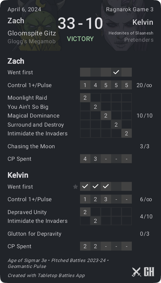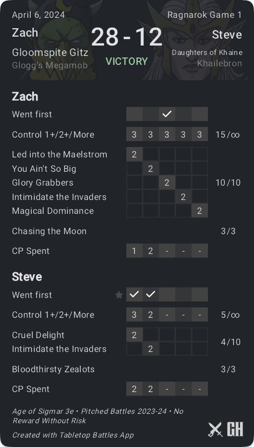 This is the second time I've played against Kelvin, the last time being in late 2023 during the same General's Handbook but I had Fyreslayers and he was rocking a Belakor-lead Slaves to Darkness army. A great opponent once again and I was more concerned about this matchup with the amount of potential mortal wounds combined with an army-wide -1 to hit which hurts my low-volume high-value attack army