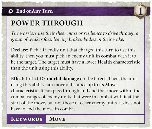 - Power Through - Okay, this is a completely new ability that has some restrictions (seen below) that gives a huge ability at the end of any turn. The D3 mortals are fine, but getting additional "out of phase" movement is going to significantly change how points are contested. Most armies have at least one or two units with a large health and movement characteristic.