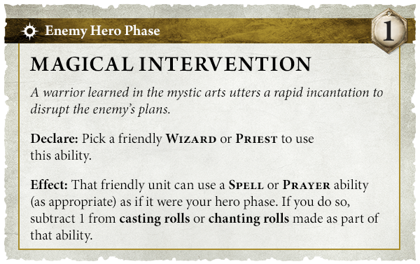- Magical Intervention is an EXTREMELY exciting ability that allows you to use a spell or prayer ability with a -1 to cast. There are several buffs that certain armies love to use (Protection of Teclis) or even a teleport spell to remove a unit from danger or reposition to prevent a deepstrike on your opponents turn.