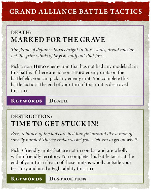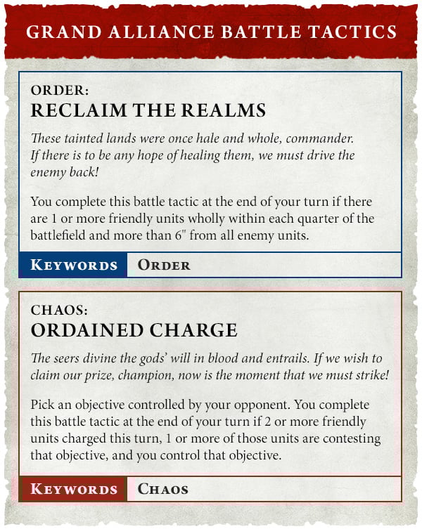 Seize The Centre" and extremely difficult tactic to guarantee you can accomplish. Unlike the current edition, you're not going to be bailed out by book battle tactics yet as each Grand Alliance is going to receive two additional tactics. One for each alliance was previewed below and none of the appear to be a "gimme."
