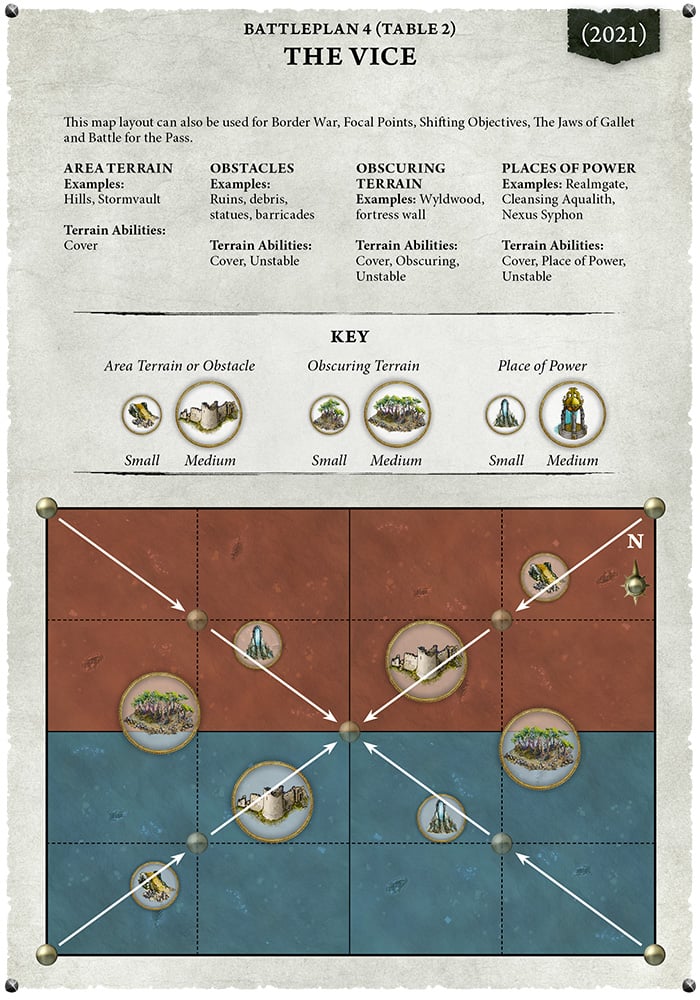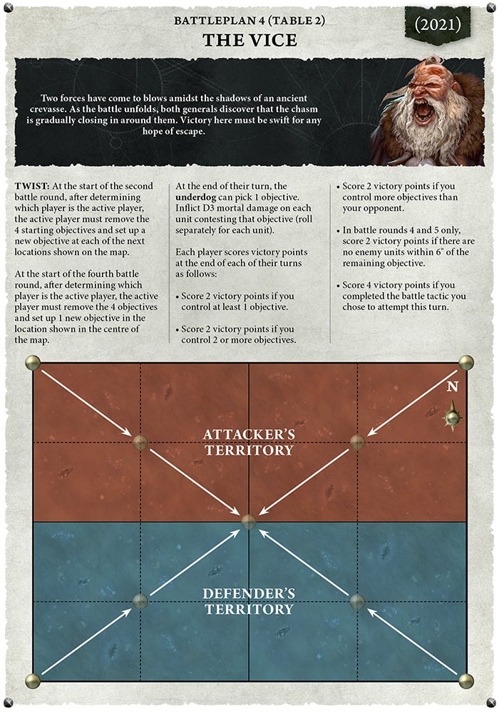 The mission set will be pulled from a "best of" from prior editions GHBs and will feature beloved missions like The Vice and Jaws of Gallet. GW is being upfront that the plans are recycled instead of giving a slightly different name to a similar battleplan. I think this is a really good thing as often times a battleplan gets given a nickname that doesn't make sense to new players. No matter what you call the plan where the objectives go towards the center, we're calling it The Vice.