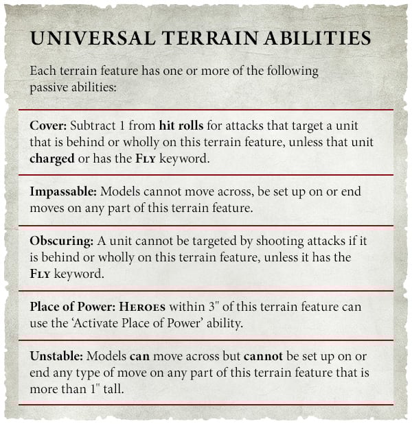 It appears like the flavor of the terrain is going to come from a set of universal terrain abilities and not the mysterious terrain rolls. Mysterious terrain has always been a weakness in the Age of Sigmar rules because it did nothing (sinister or inspiring) or had a disproportional effect one certain armies (Slaanesh LOVED damned terrain). Remembering to roll a deadly check after moving just wasn't fun.