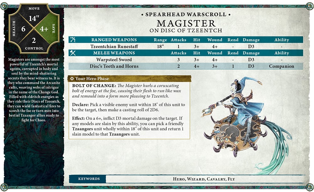 The first way the Spearheads are going to be balanced against each other is through the use of custom warscrolls that are only valid in this mode of play. They’re simplified from the core game version, with some abilities being removed entirely and others, like spellcasting, being changed from the flexible system you’ll find normally to a single skill. The Magister on Disc of Tzeentch, for example, takes the Bolt of Change spell that you find in their full spell lore and makes it a simple ability where you try to roll a 6+ on 2d6 to attack a unit and potentially heal your own Tzaangor unit.