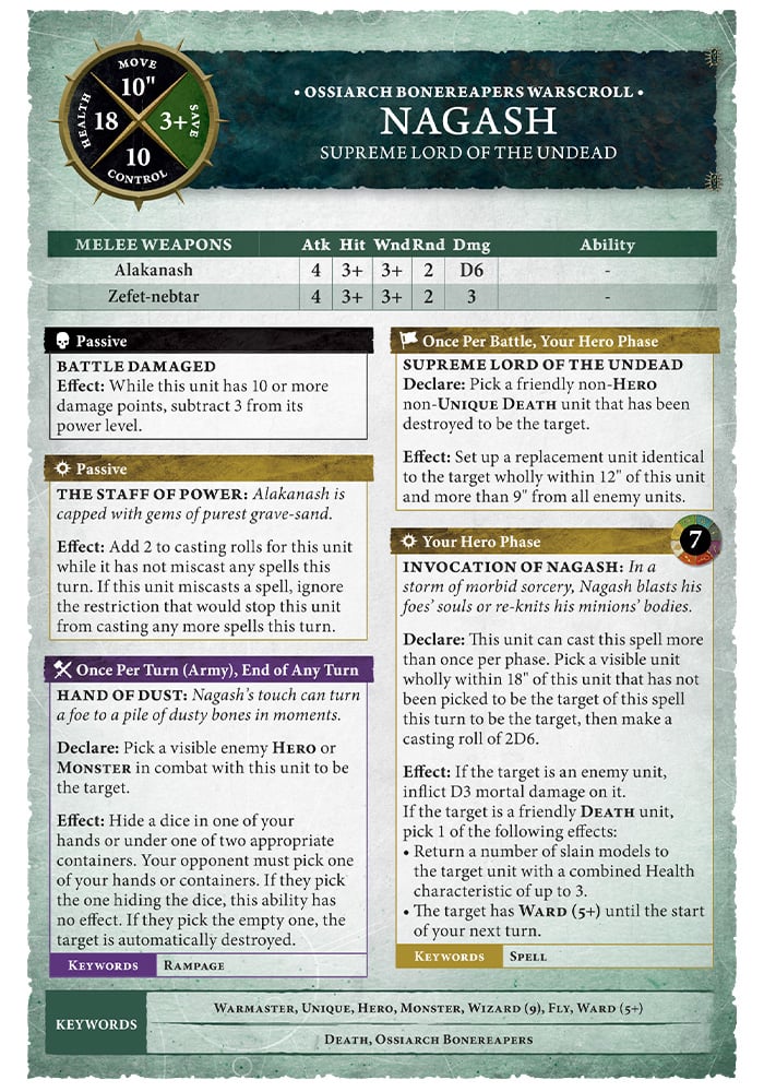 and Anti-charge (+1 Rend) but can also trigger off of keywords like Anti-infantry (+1 Rend). Nagash is a Warmaster, Hero, Monster, Wizard and can Fly. Nagash is not a priest.