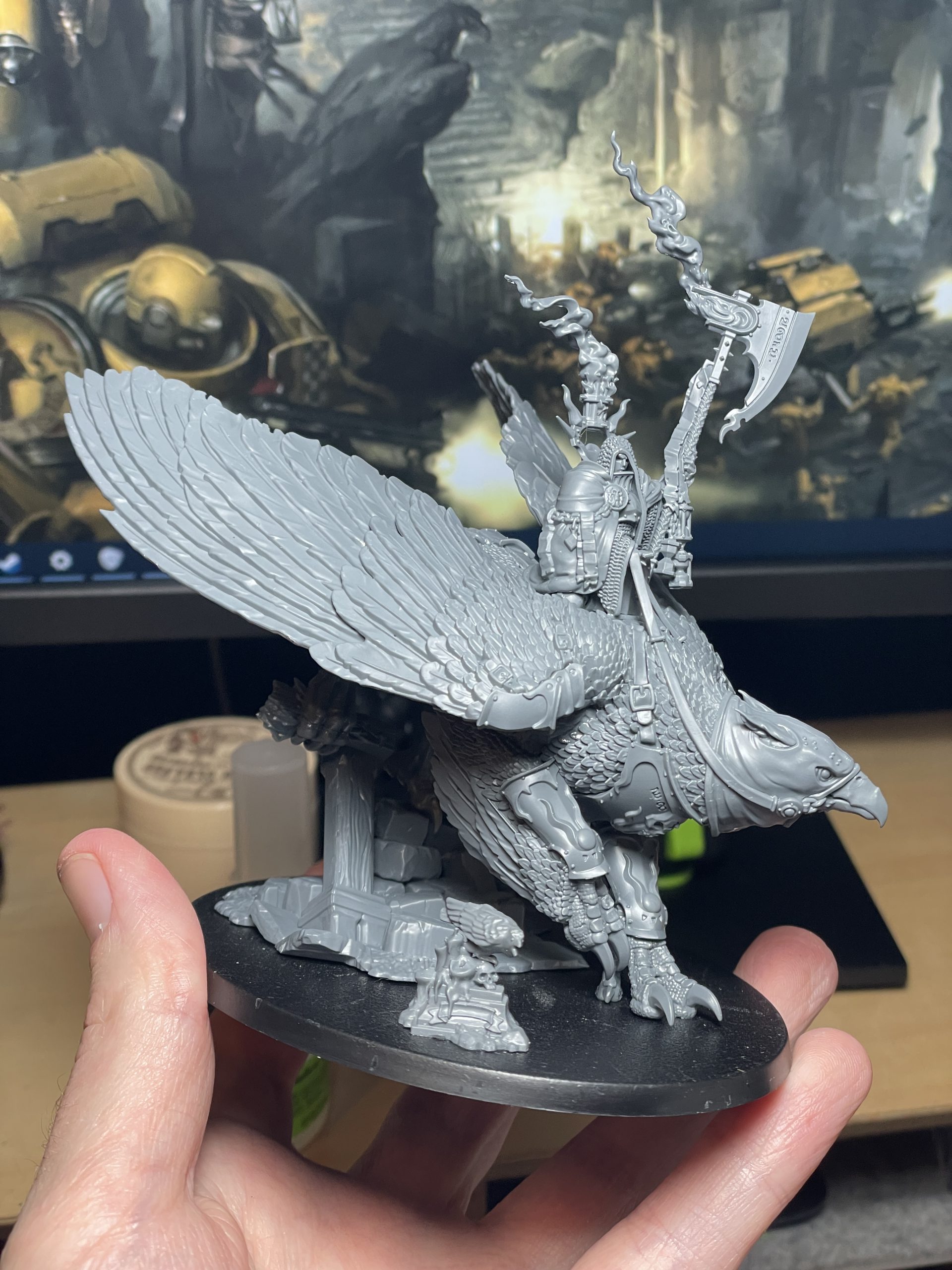 Operation with a paintbrush, reaching between the back legs of the Morrgryph in an attempt to paint the feathers on the back of its forelegs. There was also a problem I personally had with paint rubbing off the model as I tried to find good places to rest my fingers while painting the monster and rider. Trying not to catch Iridan's axe or brazier was a constant issue as well, as I didn't want to errantly snap off these more spindly bits of the model. I will say, the extra trinkets and baubles on Iridan's axe do make it a bit more structurally sound, so while I groused a bit about painting three separate hourglasses up there, they meant it didn't snap when I accidentally bumped it. Smart engineering on that, mystery GW sculptor.