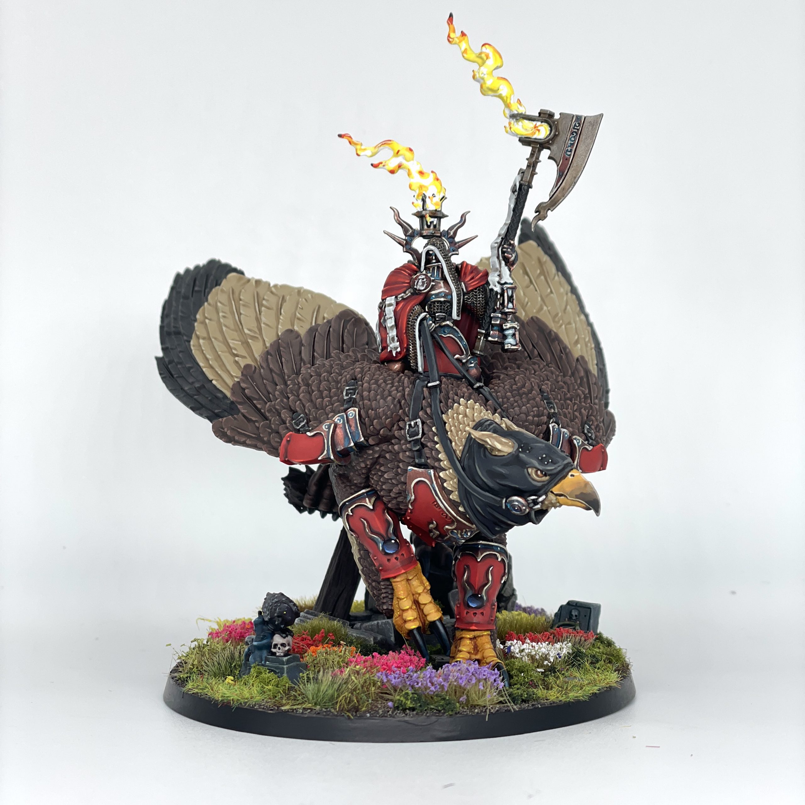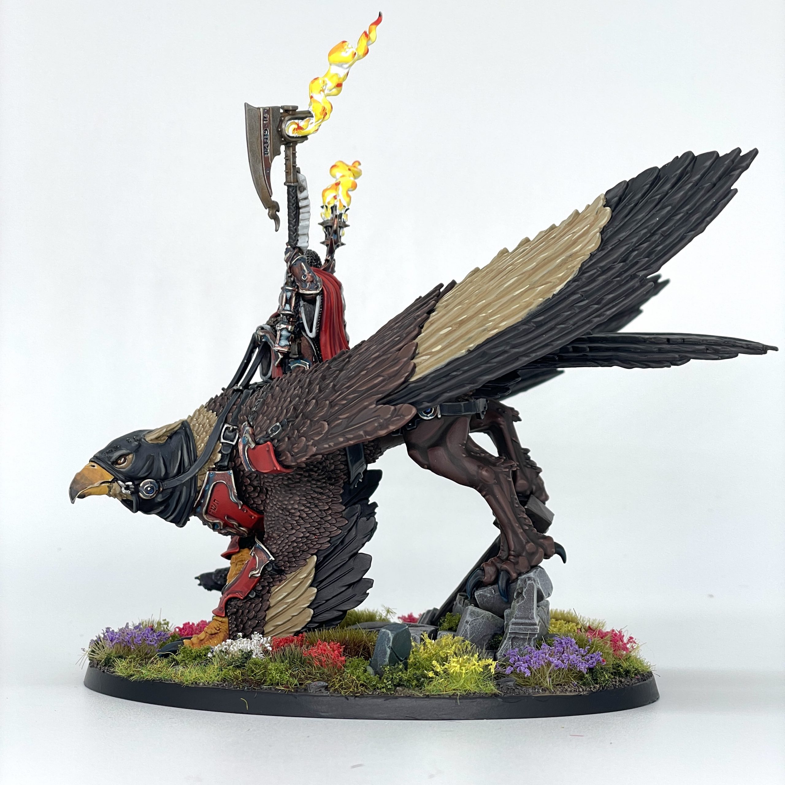 There are a few areas where you can put your own spice in the details, like the round bits I painted as gems that are usually just solid colors in the studio schemes. There actually aren't that many extraneous details either; Iridan's got those aforementioned doodads hanging off their axe, but the Morrgryph is pretty easy to grok, mostly being feathers, animal skin, and some leather. Those feathers will be a dream come true if you're looking to do a quick wash and drybrush, or feel like a Sisyphean task if you're going with a layer and highlight technique like yours truly. I found a sort of zen in it, just wiling the hours away with multitudes of browns and tans on all the feathers here, but it's not a technique for the painter in a hurry.