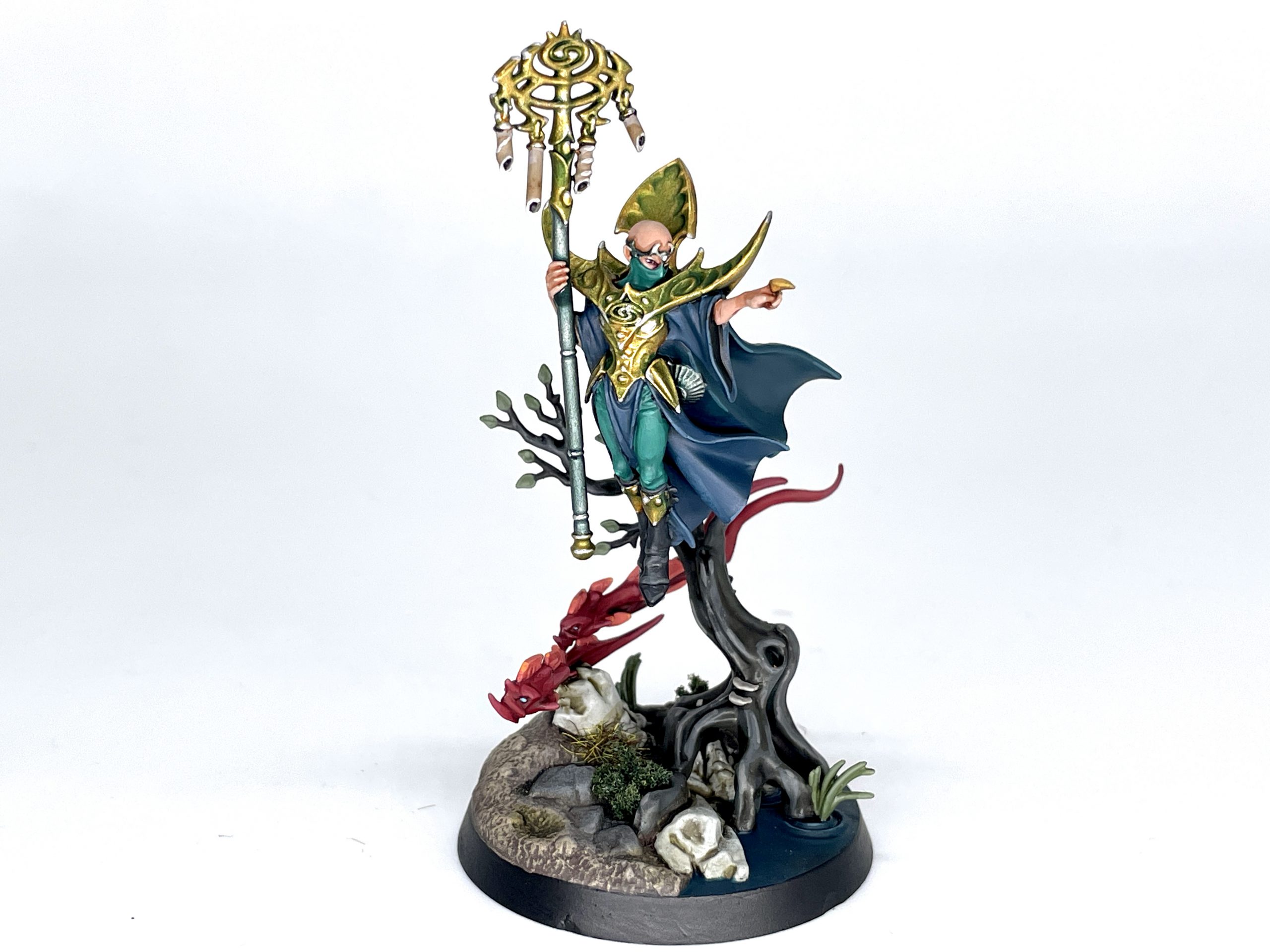 After working through these models for some time, I would recommend finding a way to mount them temporarily on scrap bases so you can get into their cloaks. Shakana is just going to have to deal with some primer black parts on the interior of her cloak, because I ain't getting a brush in there. Otherwise, working around the trees, fish, and other doodads is going to be more trouble than it could be.