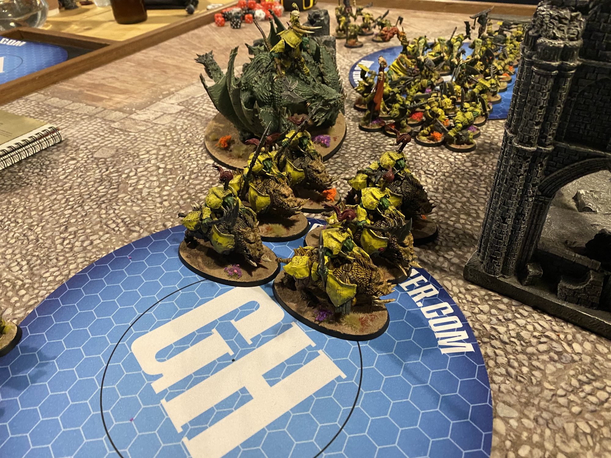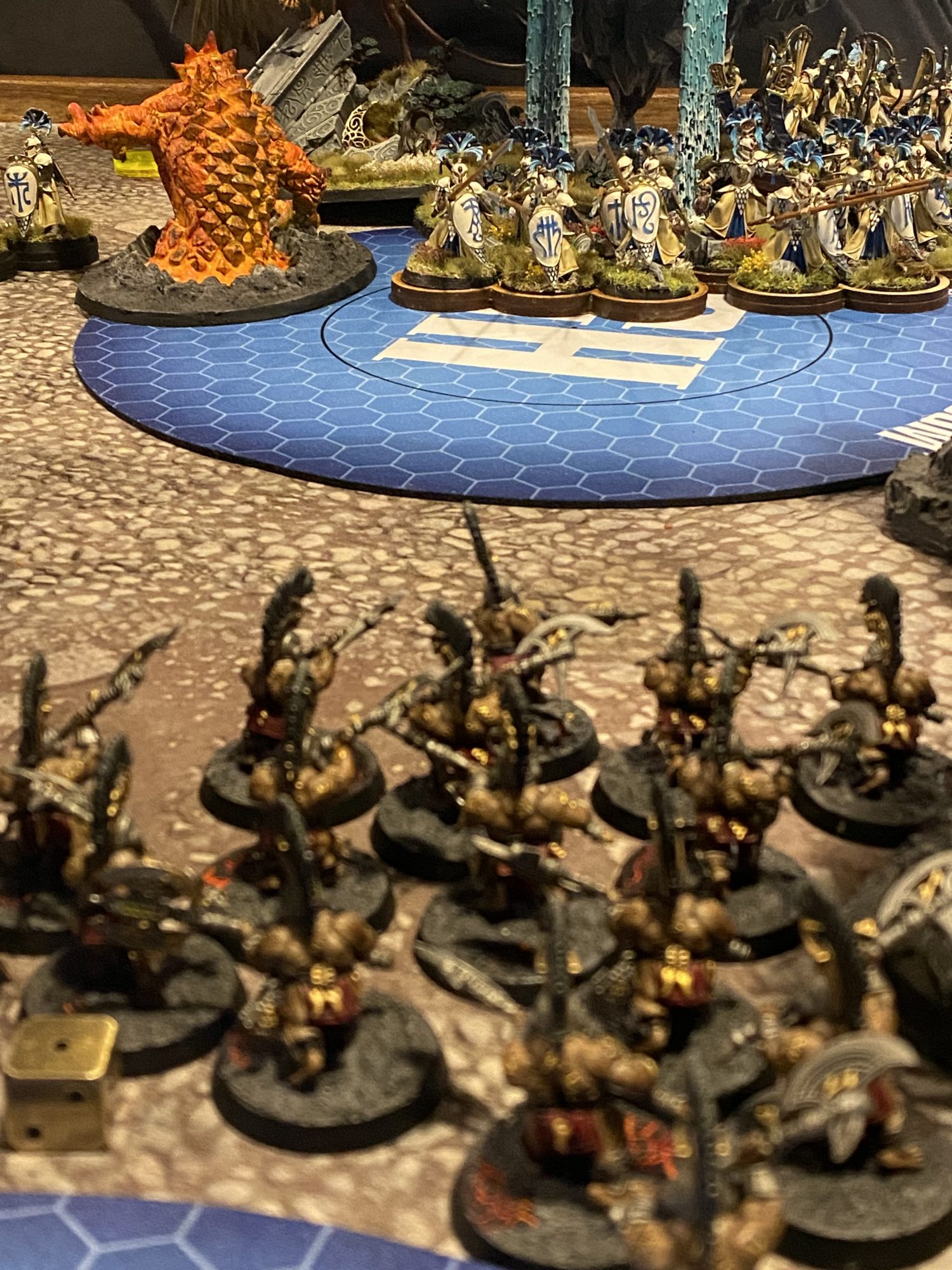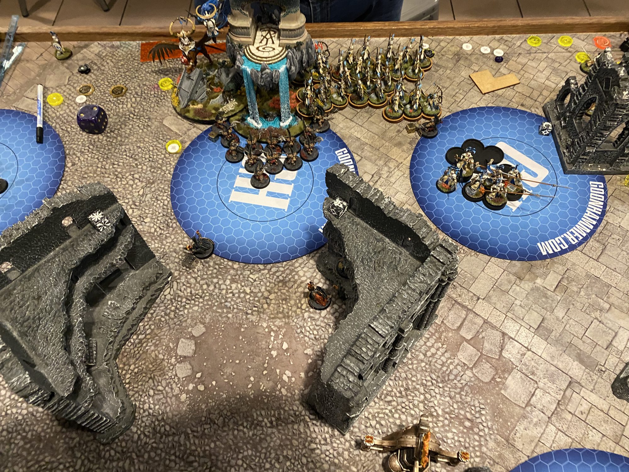 This was going to be an uphill battle from the start, a 6 objective battleplan. This is difficult for my army to score against an opponent with a lot of shooting, can shut down my orders, and causes massive debuffs to my Bravery. Stacking Bravery debuffs onto Hearthguard means that having a 4+ ward means very little when half a dozen or more run after losing just 1 model.