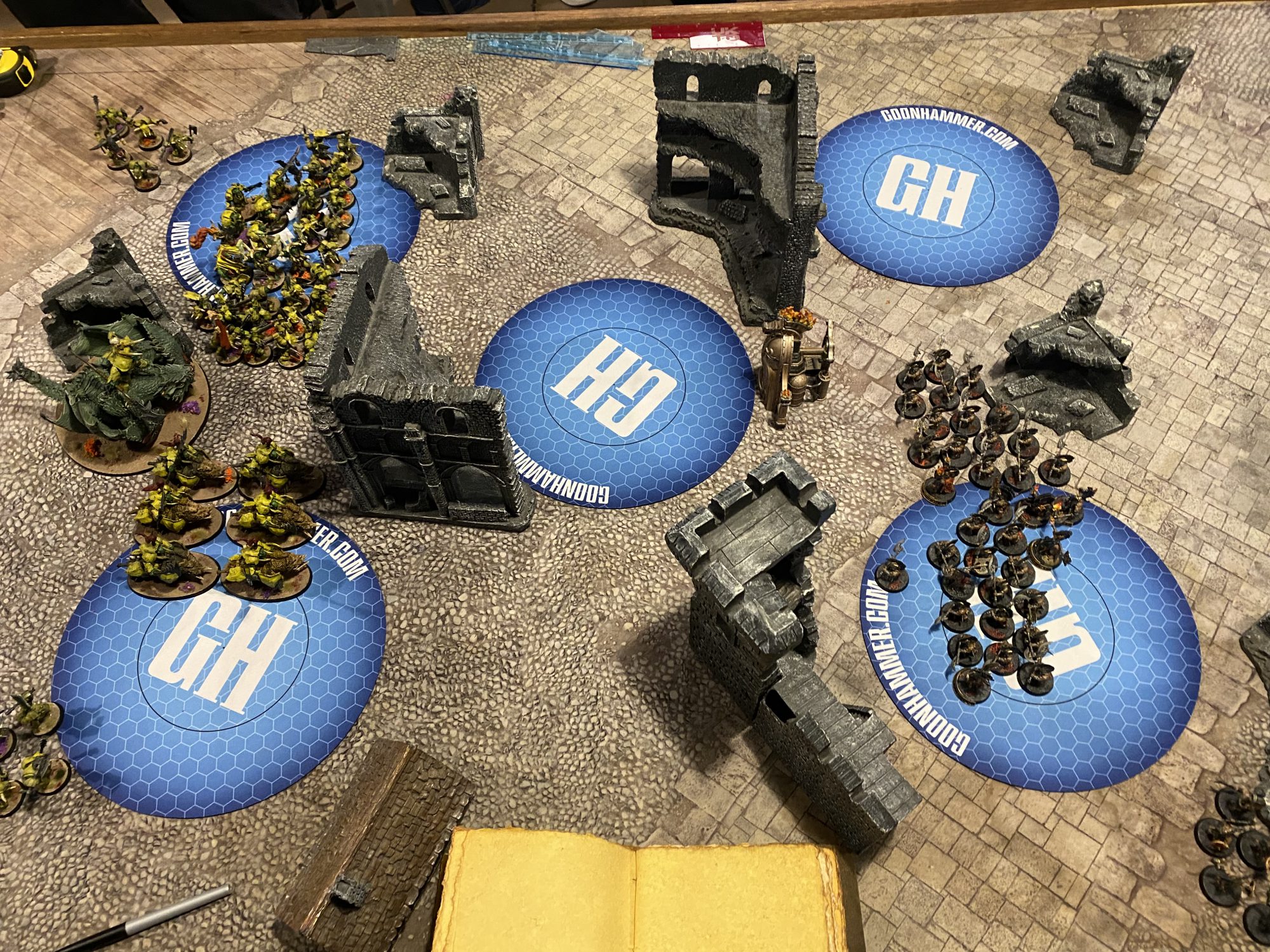 Next up was Jack's Ironjawz which leaned extremely hard into Ardboyz. It was awesome. For those interested it was also ruled that Aggressive Expansion could not be scored turn 1 using the objectives in your territory. There's an argument for them not being wholly in your territory since 3/4 of the objective are off the table, so it was nice to see this ruled in the pack beforehand so everyone knew what to expect!