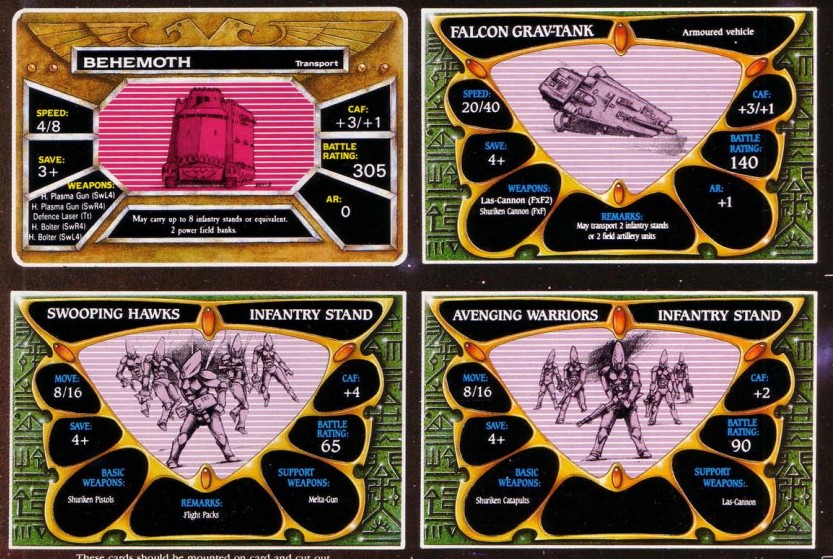 Unit cards for Space Marine 1st edition from WD117 - Note the individual arcs for 5 different weapons on the Behemoth and the early version of Dire Avengers for Eldar - Credit Games Workshop