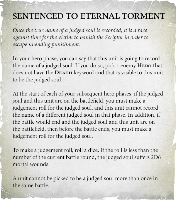 In your hero phase, you can pick a non-Death enemy hero and roll a d6 in every subsequent hero phase. If you roll under the current battle round, the judged soul takes 2d6 mortal wounds. Once successfully judged, you can’t judge the same hero again. The fact that this unit can’t affect Death heroes at all means that if you happen to run into one you’ve just wasted 150 points of your army - there isn’t a secondary effect to give this unit any value.