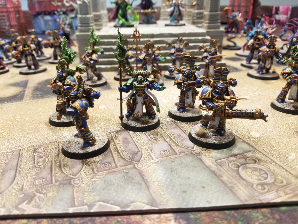 Thousand Sons are in a weird place in Boarding Actions. Their ability to throw out mortal wounds with every unit in the psychic phase makes them very deadly, but their limited datasheets and high costs can make it difficult get everything you want into your roster. There are basically two builds you’re looking at with Thousand Sons in Boarding Actions: Three units of Rubrics, or Rubrics + Scarabs (double scarabs is possible, but taking only 3 units in Boarding Actions games seems like a mistake to me). Either way, your cheapest character options are the Infernal Master and the Sorcerer, each of which cost you 90 points and the former of which is likely the better play. One cool part about Boarding Actions is that while teleporting is very powerful the fact that Sorcerous Facade is Warp Charge 11 makes it just too unreliable to use and so there’s a lot of reason to use a different great cult. In particular, the Cult of Magic, Cult of Time, Cult of Scheming, and Cult of Knowledge all have real value in the mode. Empyric Trespass in particular can be very nasty as it has a 24” range and doesn’t require line of sight.