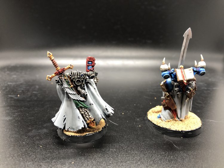 All the time I didn't spend on the 11-point bolter joes, I put into these two. Lesson learned here: I should absolutely not have assembled Cypher before painting him. Those robes were particularly unkind, and results would have been both easier and better if I'd done him in sub-assemblies. I put more than the usual effort into the Sorcerer, who is the Dark Vengeance master with a Chaos backpack, a Deathwing head, and every single book-shaped bit I had stuck on to him. He was painted as a Librarian more because I wanted to see if I could remember how to layer than anything else. His armor was built up from Vallejo Stormy Blue in the deepest recesses, to a 50/50 mix of Bone White and Electric Blue on the very highlights.