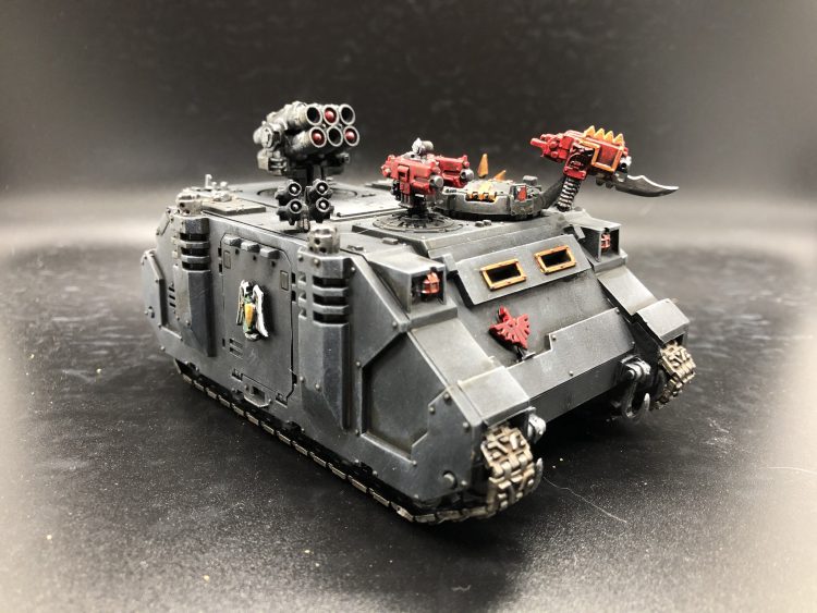 Ah, the venerable old Rhino kit. Easiest thing in the world to dry-brush and pinwash. I wish I'd had more stowage options to make it look more weighed down, but I wanted to up-gun it as much as I could, and it has the same mix of loyalist and heretic iconography, without overdoing it.