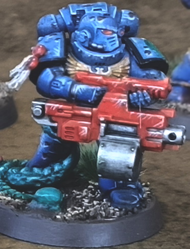 It's important to break up all of that blue with some other colours to provide strong contrast. This is why I went with the classic red bolters instead of the contemporary black ones (also as a homage to the mid-90's, 2nd Ed. Ultramarines I feel in love with). I also used judicious amounts of blood dribbling and streaking down faces and armour to help break up the blue. The basing, dark brown and a medium-high saturation green static grass are other colours that complement/contrast the blue without blending into it or having too high a contrast to it (also, it's easy to implement across an entire army consistently.
