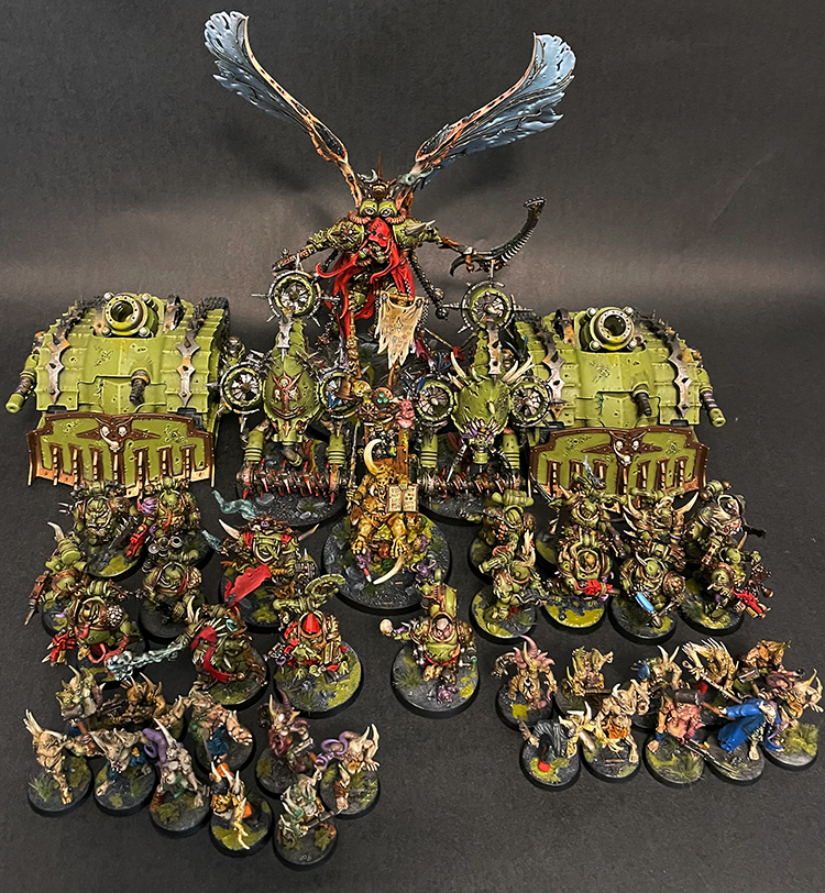 Finishing your own army is core to the Warhammer 40,000 hobby. In our Army Showcase series, Goonhammer contributors take a look at the armies we’ve been collecting for years, and the new ones we’ve just finished – what drew us to them, why we keep building and painting, and how they play on the table. This week PierreTheMime is discussing his Death Guard in all their slimy goodness. If you want to know more about how to paint the models here, the scheme is featured in our How to Paint Everything: Death Guard article.