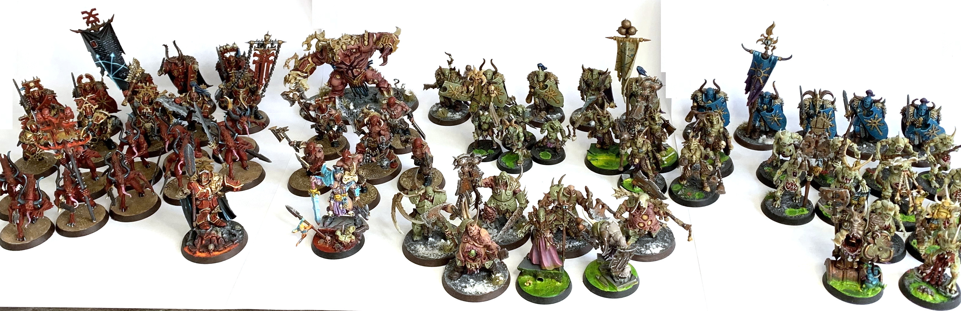 This army started out as the 5 Blood Warriors and Blood Reavers from the cheap Age of Sigmar starter set (Storm of Sigmar). Then I kept adding to it with some models from the full-fat starter (thanks eBay), plus a lot of Chaos Warriors stuff which were initially going to all be Khorne, but I decided to make some for the other gods.