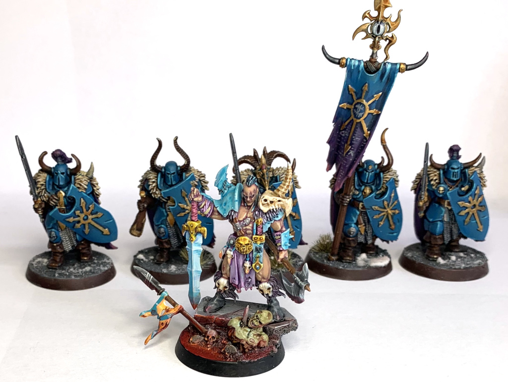 Of the 4 original Chaos gods (sorry Great Horned Rat), 3 are represented and the 4th (Slaanesh) is only represented by the Darkoath Chieftain, so I can see some Daemonettes in this army's future.