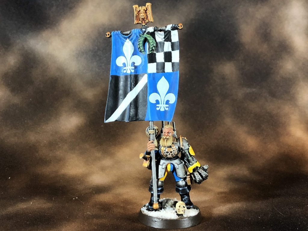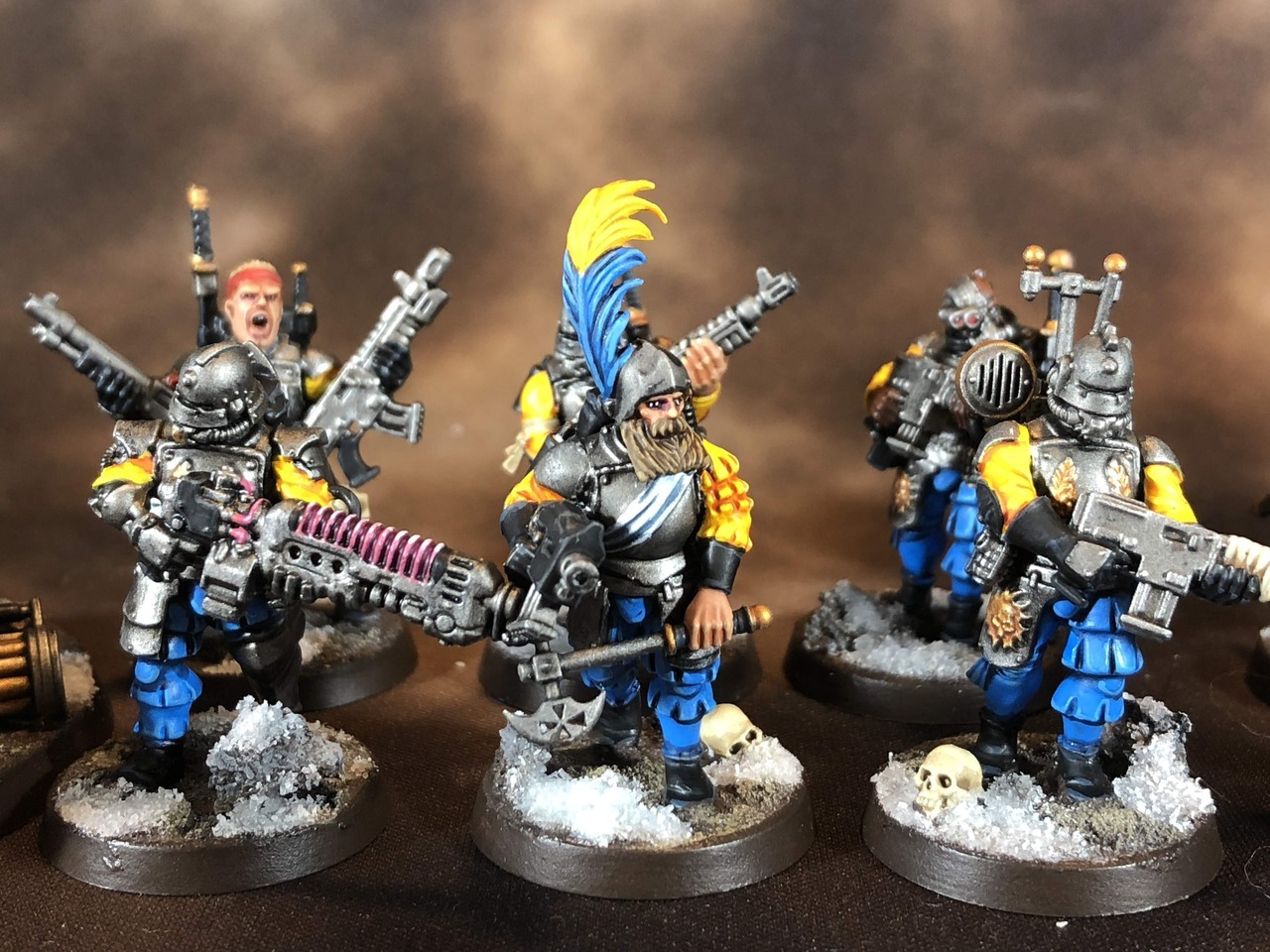 A medieval-themed army needs a standard bearer, and Jarran Kell was the man for the job. This also meant these guys got to take advantage of the excellent Cadian rules, which was a nice bonus. This was an extra fun little kitbash as it got to drive home the two flavors the army had, which were obviously French and Swedish. It's no secret that the army's color scheme resembles a certain tax-dodging Swedish furniture manufacturer's, so I thought I'd push that with this guy.
