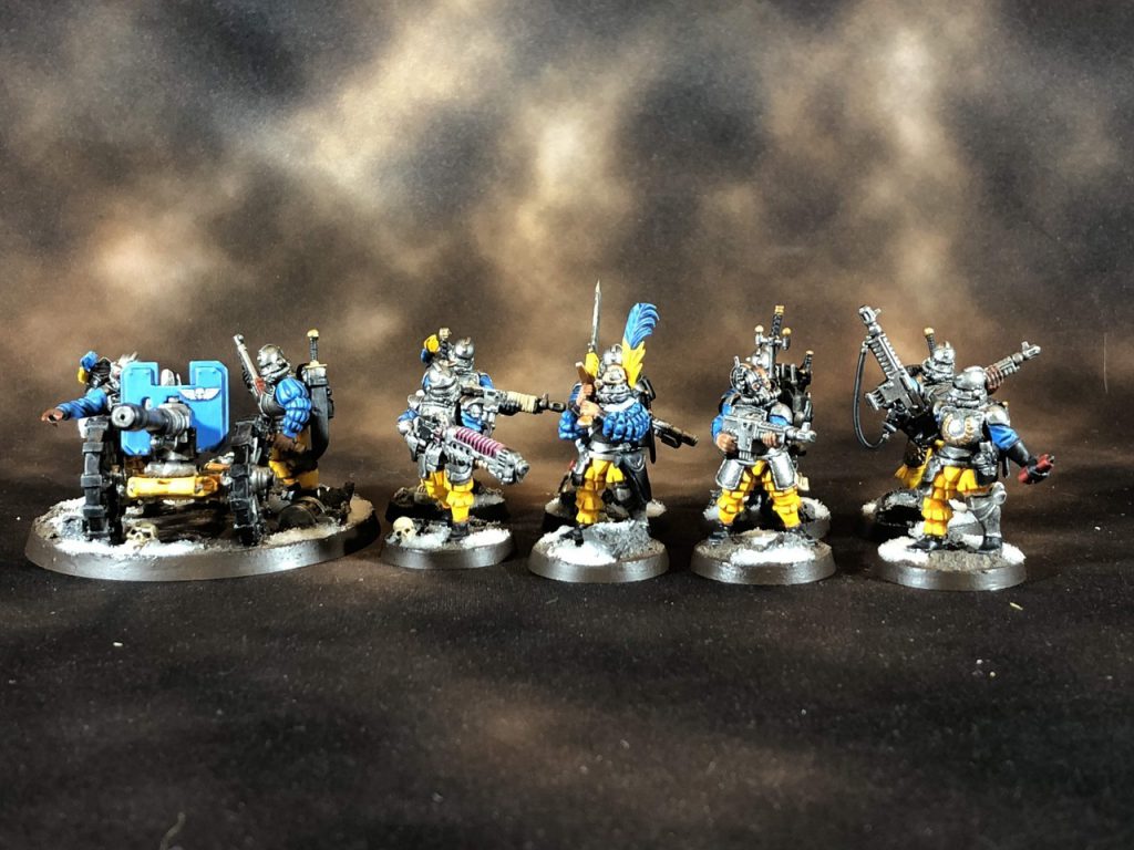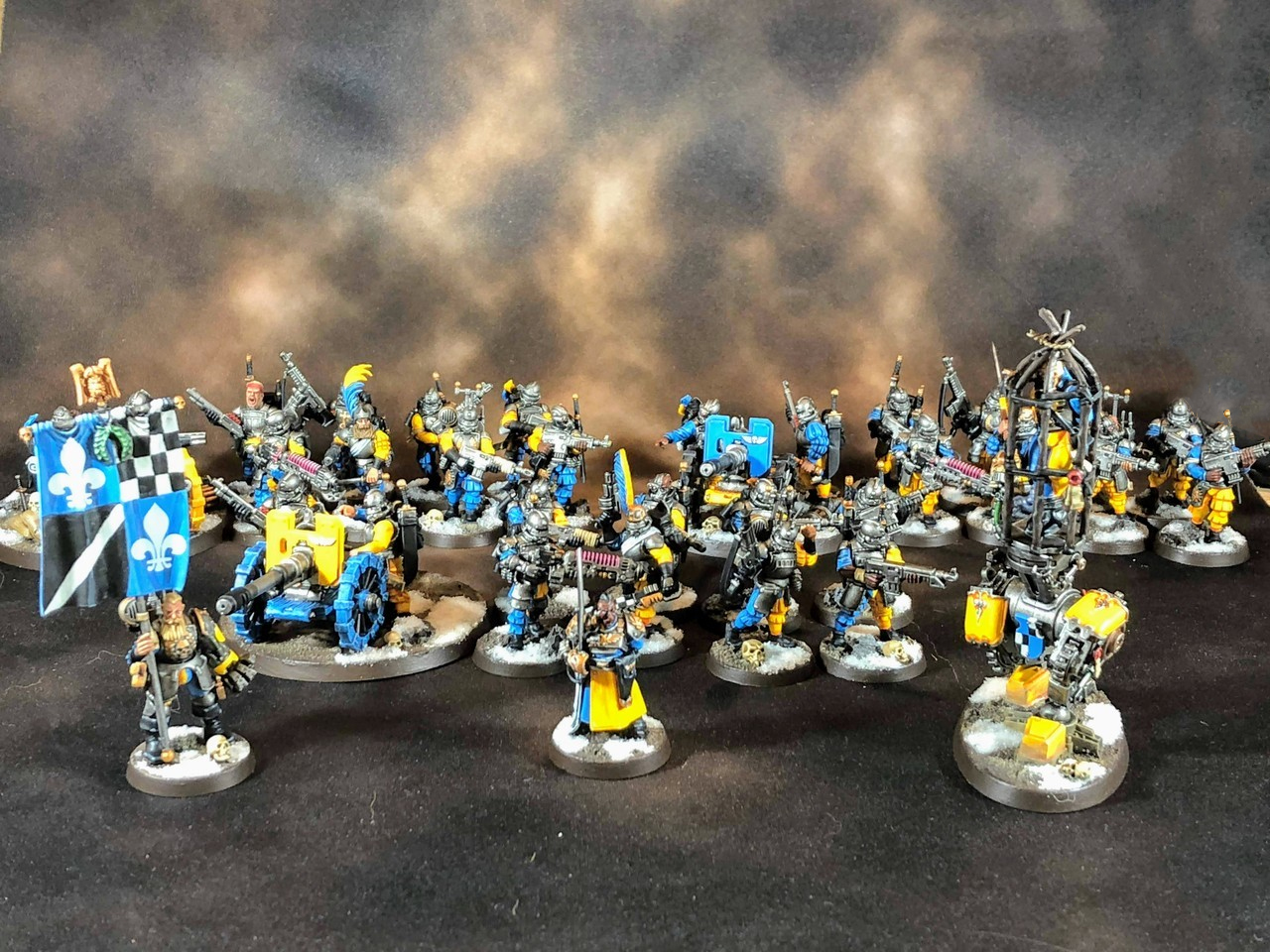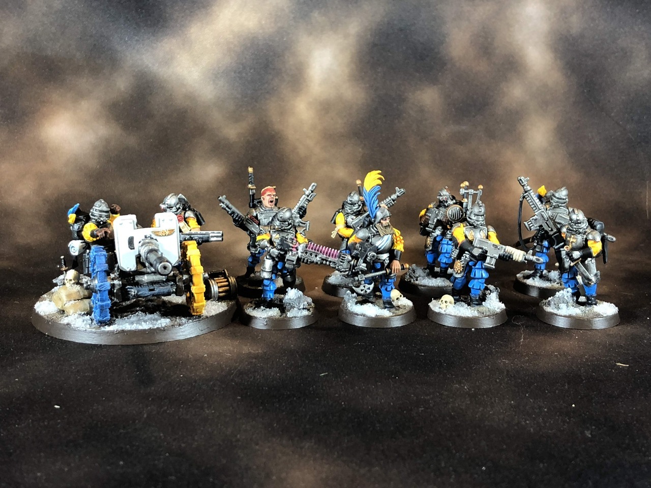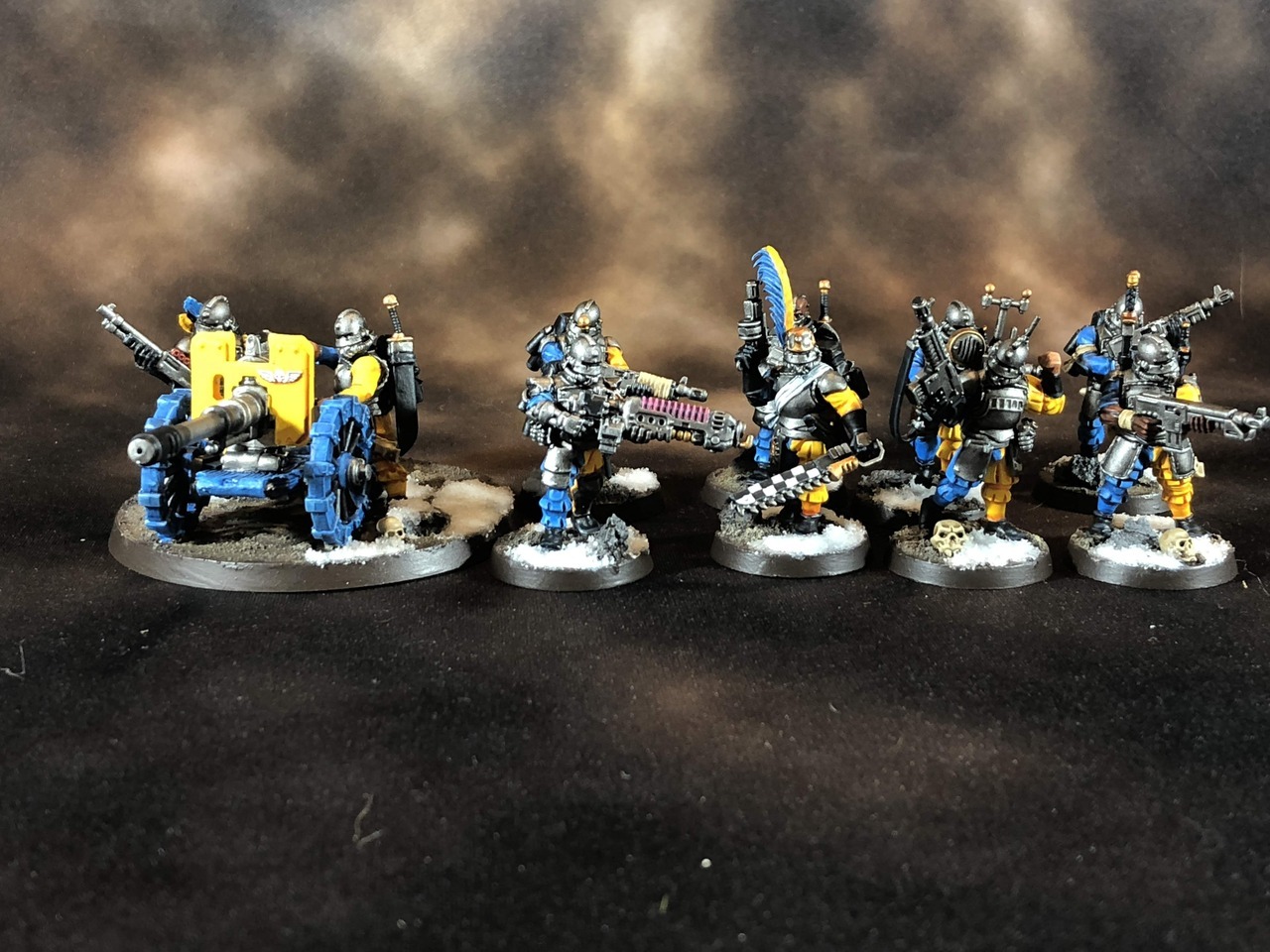 I really wanted to push the medieval theme with these guys. I knew the Genestealer Cult autoguns would be perfect for a more archaic looking lasgun stand in, and the Skitarii bucket helmets would be great for the medieval theme. I hemmed and hawed and made a lot of photoshop bashes for bodies until I tested the bits on some Freeguild Greatswords I had lying around. The fit was just about perfect! I'd also amassed a load of backpacks from Imperial Guard heavy weapons squads and vox casters from Tempestus Scions, which would bulk out the silhouettes and make them look more futuristic. For the heavy weapons, I figured the plasma guns from the Skitarii kit would fit nicely, and the bionic hands would add that bit of visual narrative that these things overheat all the time. The autocannons accompanying them are on metal Hellblaster Volley Gun chassis instead of the typical Guard tripods, as I wanted to give them the look of field guns.