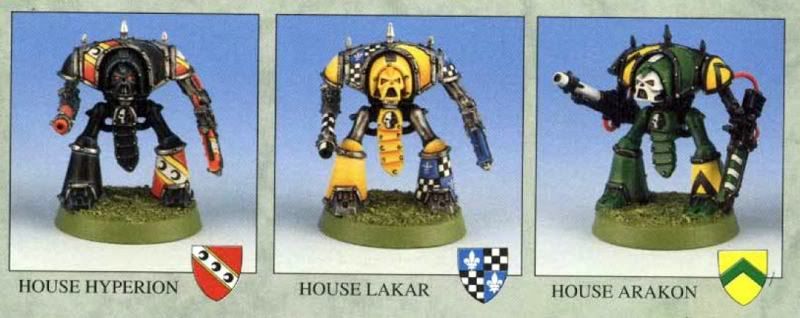 Imperial Knights Renegade box set. Two giant robots, a smattering of terrain, and some Battletech-lite rules for an optional game I'll probably never play? Sign me up! I got to building up my first Knight from that box - a Knight Crusader, pretty quickly. Since I figured I would only have one or two of these, I decided to go for a suitably flamboyant and old school paintjob. Perusing old Epic catalogs, I came across one scheme in particular that sang to me - the scheme of House Lakar: