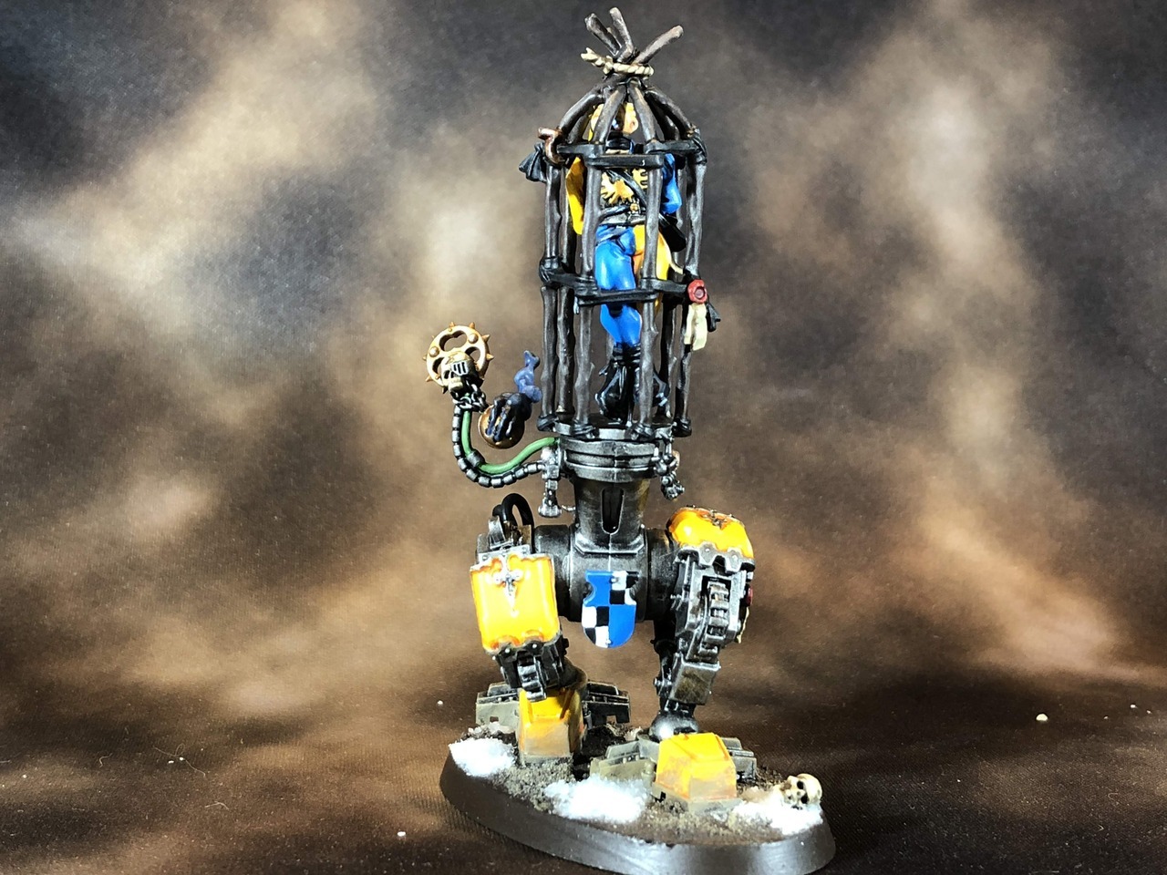 I figured a backwards, medieval planet wouldn't be huge on psykers, but having one made sense for the army. I thought the best way to represent one would be to make something suitably archaic and inject some grimdarkness into the army. I settled on this caged psyker in what I call the Auto-Repenitent, a mechanical steed that takes the psyker to the front line where they can repent for their sins. I painted it to match my Knights, and it serves as a visual space between my infantry and the Armigers above them.